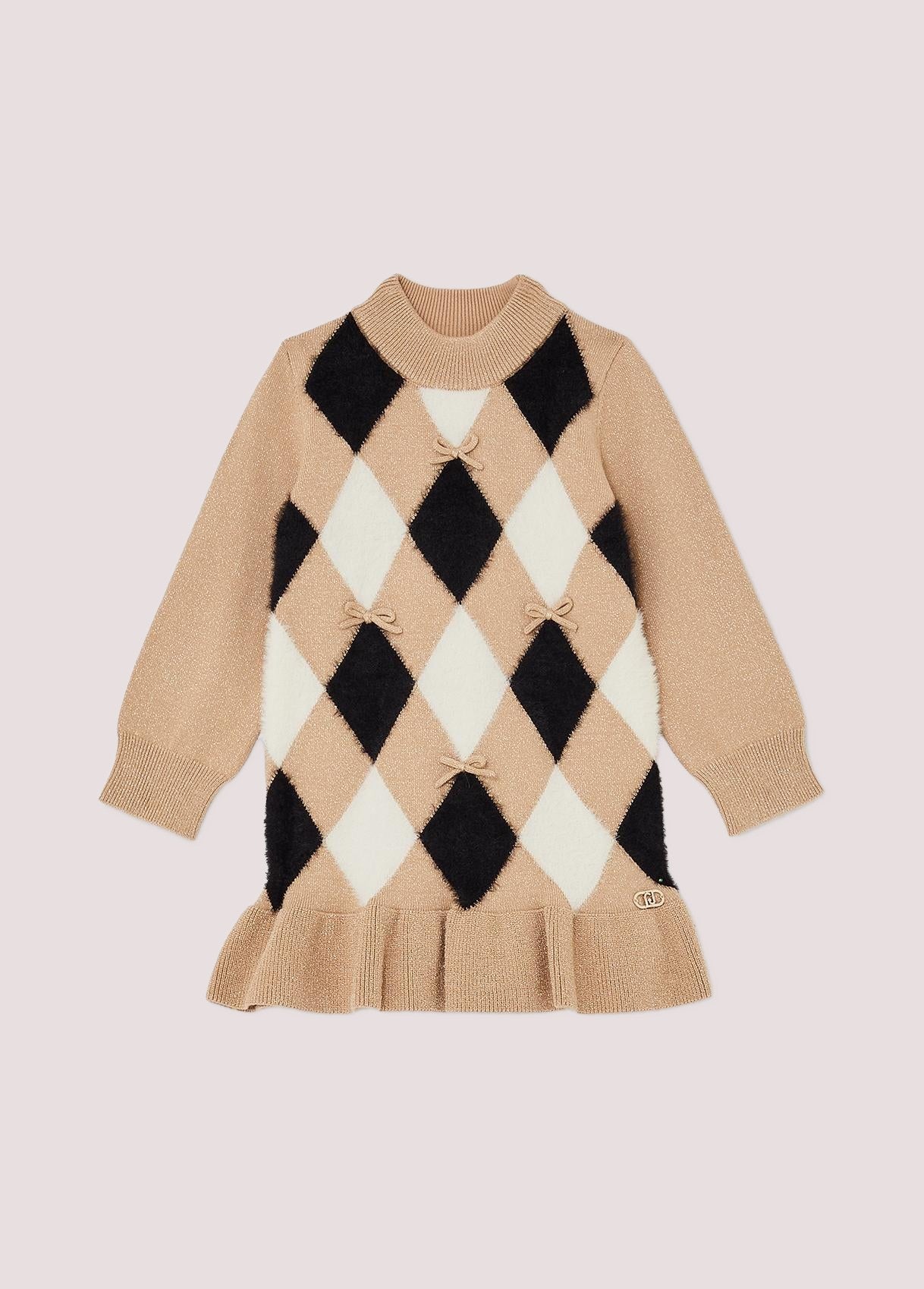 Abito in maglia di misto viscosa e lurex®Motivo a rombi jacquardFiocchetti sul davantiCollo altoManiche lungheBordi a costineLogo in metalloProdotto "Liu Jo Better"