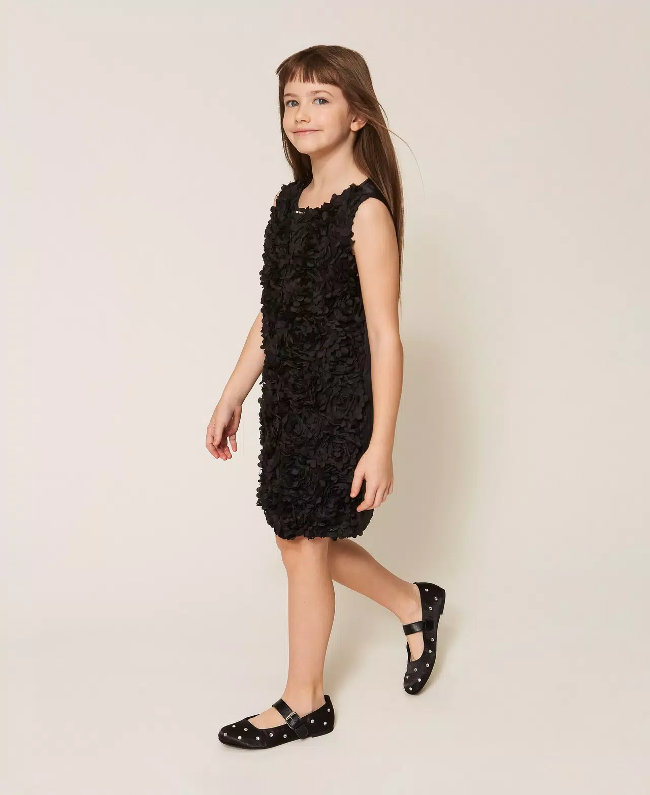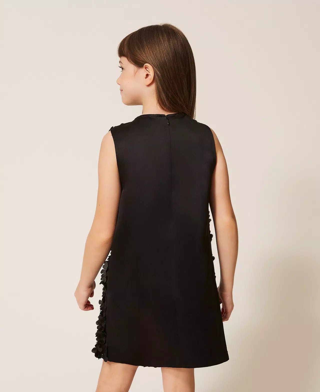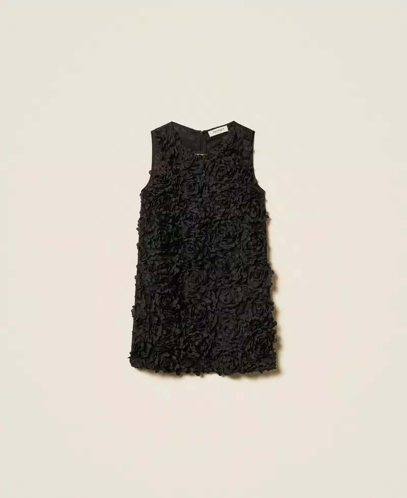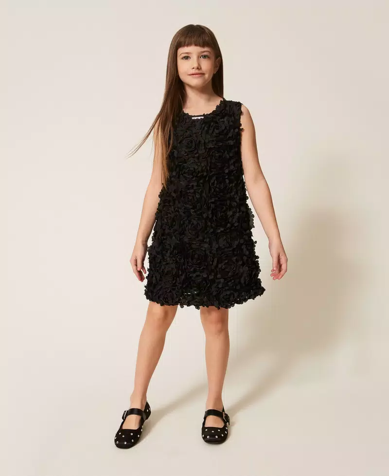 Abito corto da bambina in raso e tessuto lavorato effetto rose. Ha collo tondo, chiusura con zip sul retro, fodera in mussola di cotone, linea leggermente svasata.