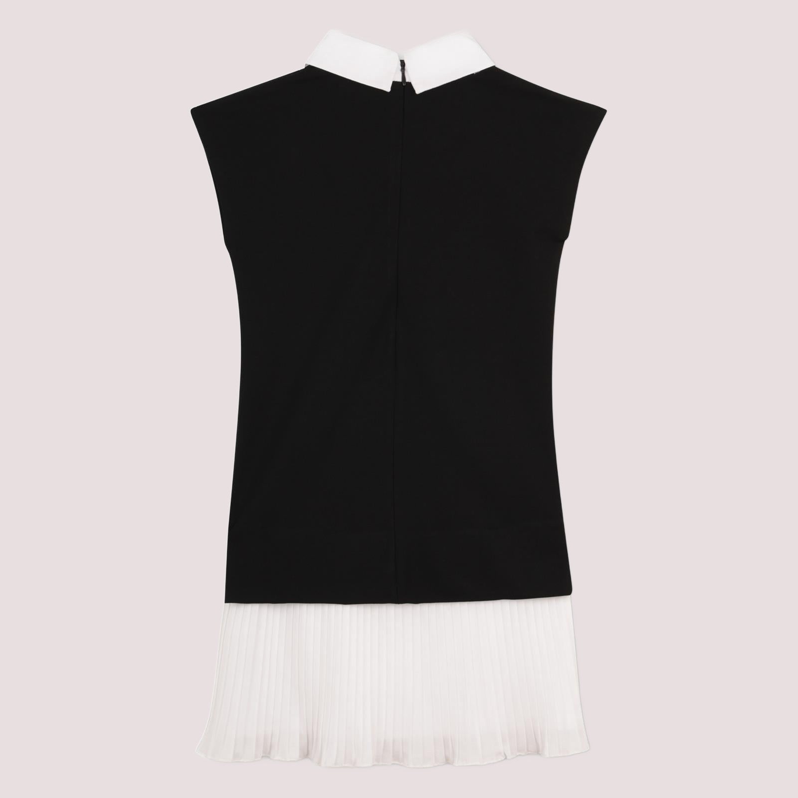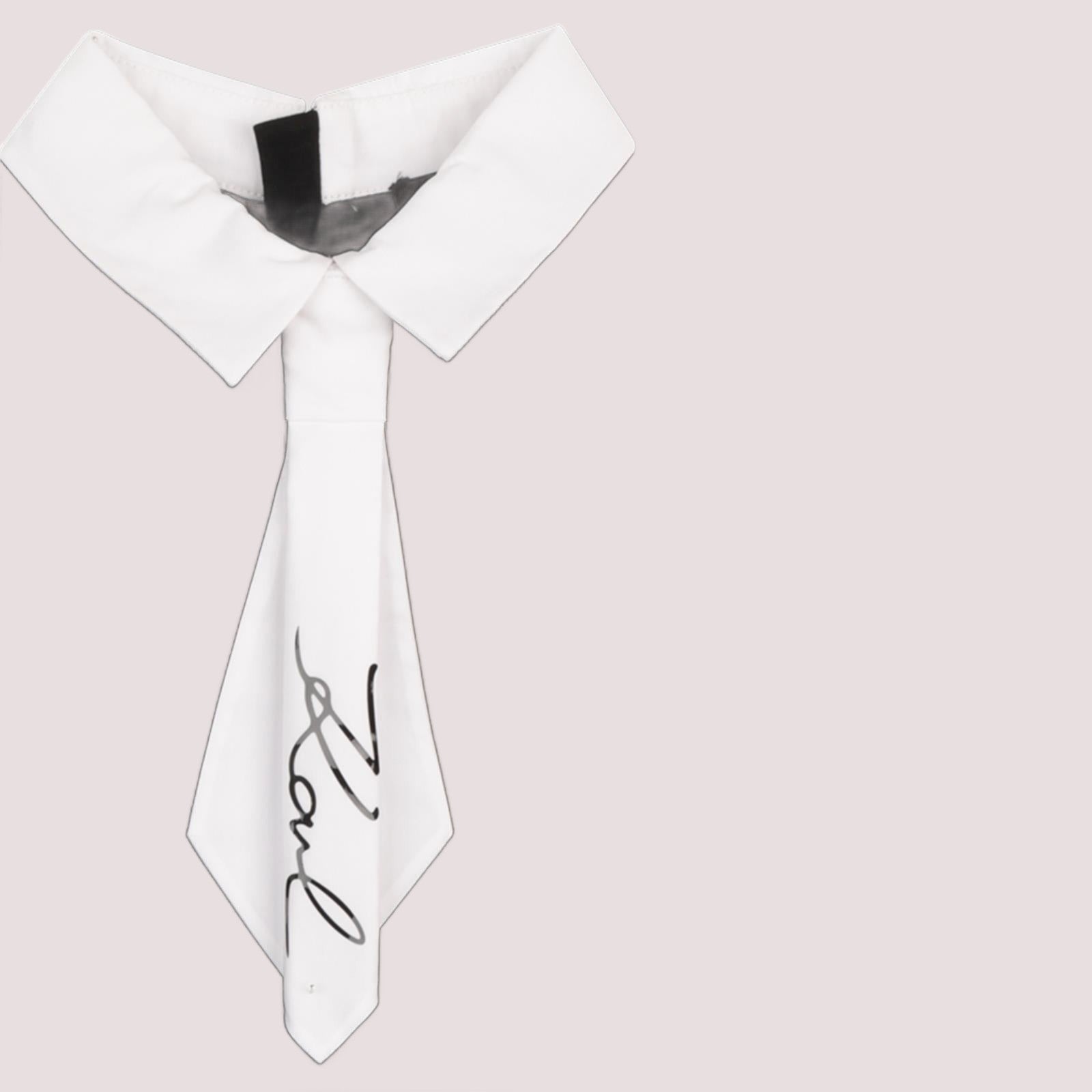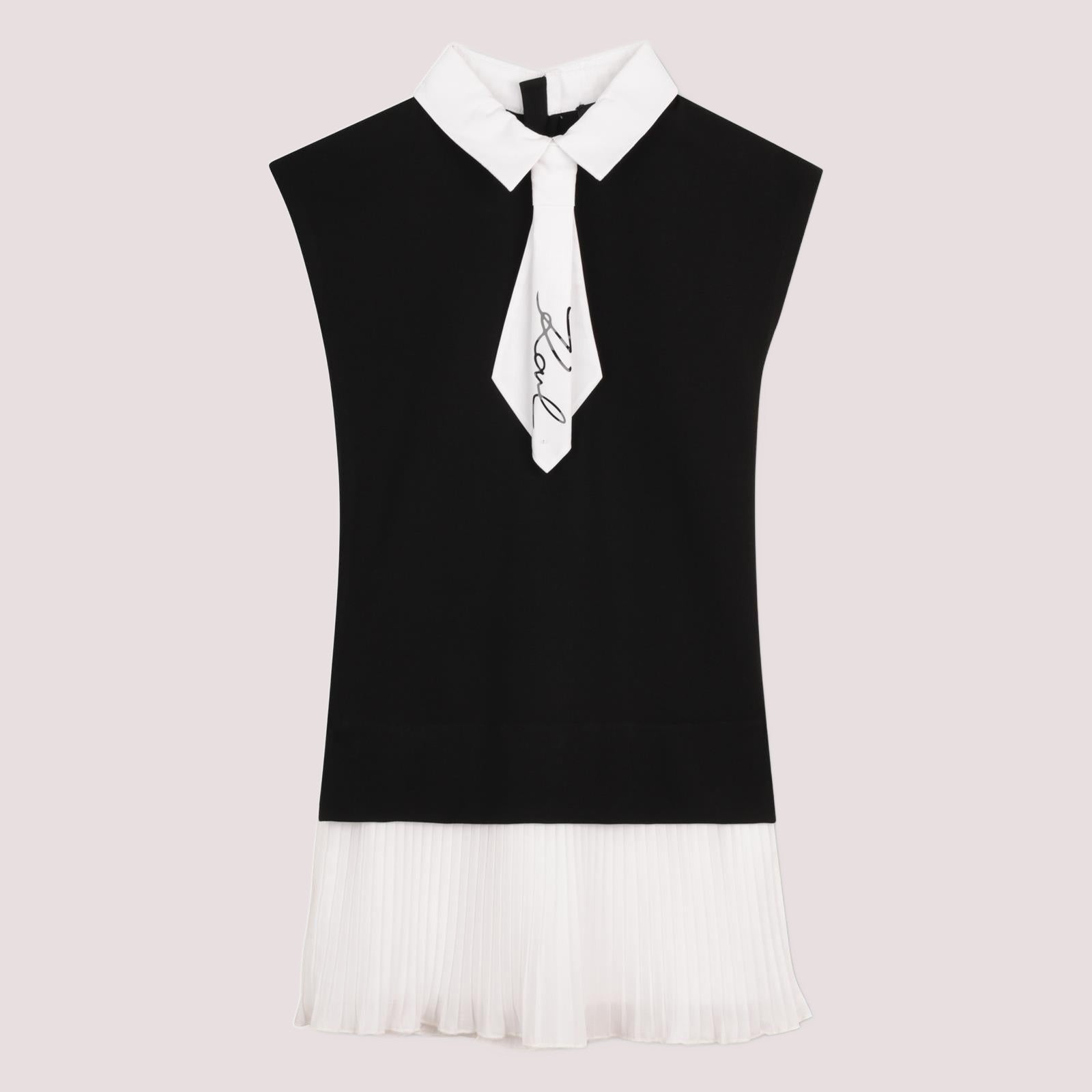 Abito a maniche corte in tessuto milano (62%VI 33%PA 5%EA). Colletto e laccetto removibile in popeline di cotone. Chiusura con cerniera sul retro. Ricamo KARL SIGNATURE sul colletto. Fondo plissettato in crêpe di poliestere.