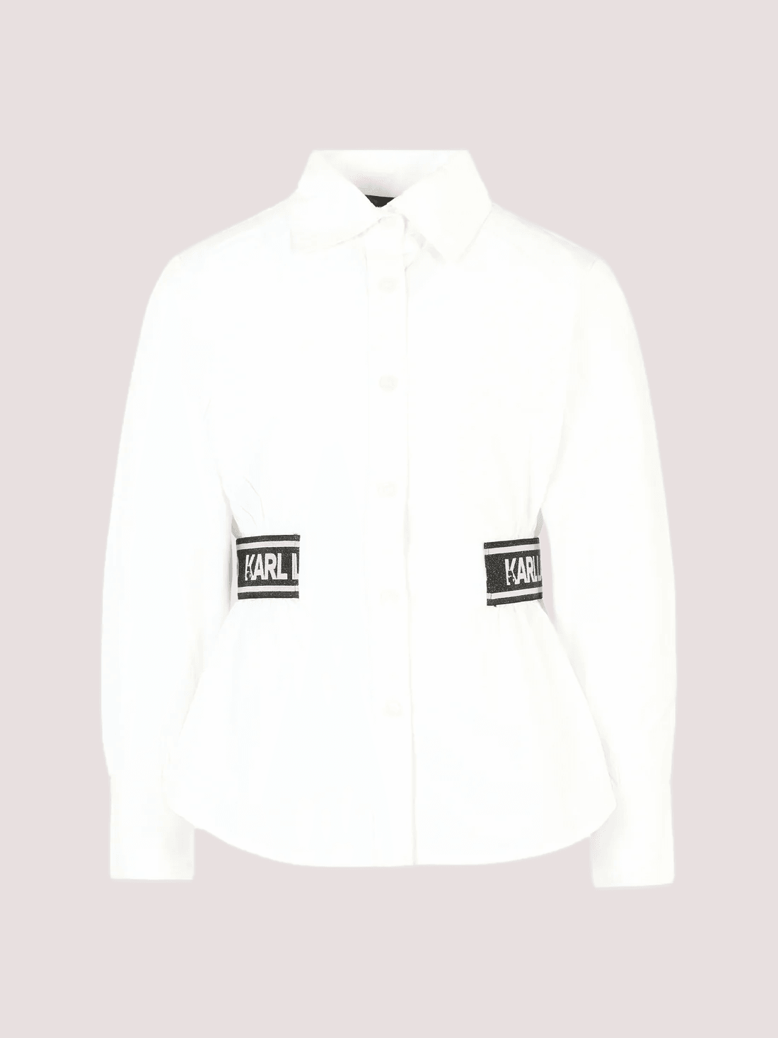 Camicia bianca in popeline di cotone, a maniche lunghe, con colletto a punta, chiusra frontale con bottoni logati e banda elasticizzata con logo jacquard sui lati.Composizione: 100% cotone