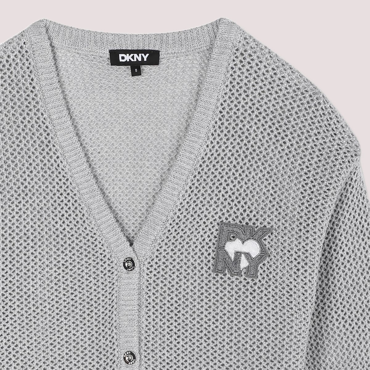 Cardigan in maglia di cotone con dettaglio in filo argentato. Chiusura con bottoni sul davanti. Toppa sul petto con logo Mini-me DKNY Heart of NY.