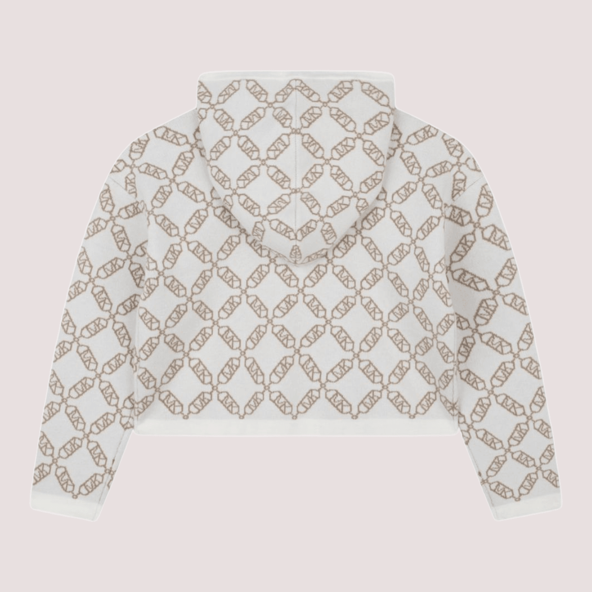 Cardigan bianco di Michael Kors sono perfetti per l'inverno, con una delicata stampa marrone chiaro su tutta la superficie. Realizzato in tessuto morbido e caldo. Il design elegante combina un tocco sportivo con un tocco lussuoso. Ideali per le giornate invernali informali o per rilassarsi a casa. Abbinali al cappello e alla sciarpa coordinati per un outfit invernale completo e alla moda. Un capo indispensabile per la stagione fredda.