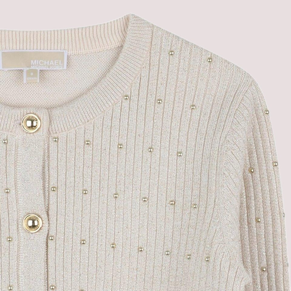 Cardigan Michael Kors realizzato in maglia di viscosa elasticizzata che offre morbidezza e comfort. Il modello è caratterizzato da lavorazione a coste verticali arricchita da micro borchie applicate e completata da bottoni dorati frontali che aggiungono un tocco luminoso e raffinato.