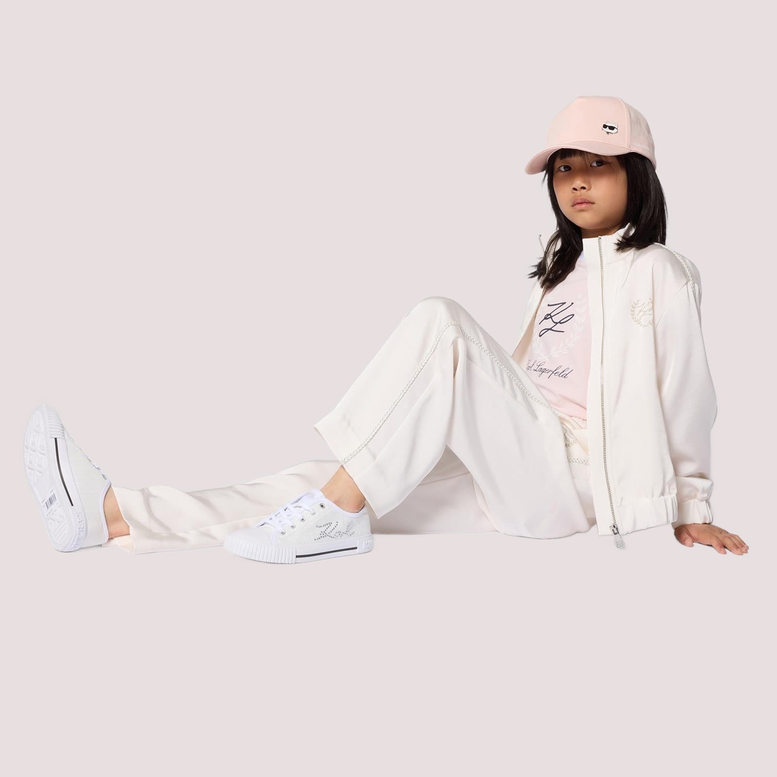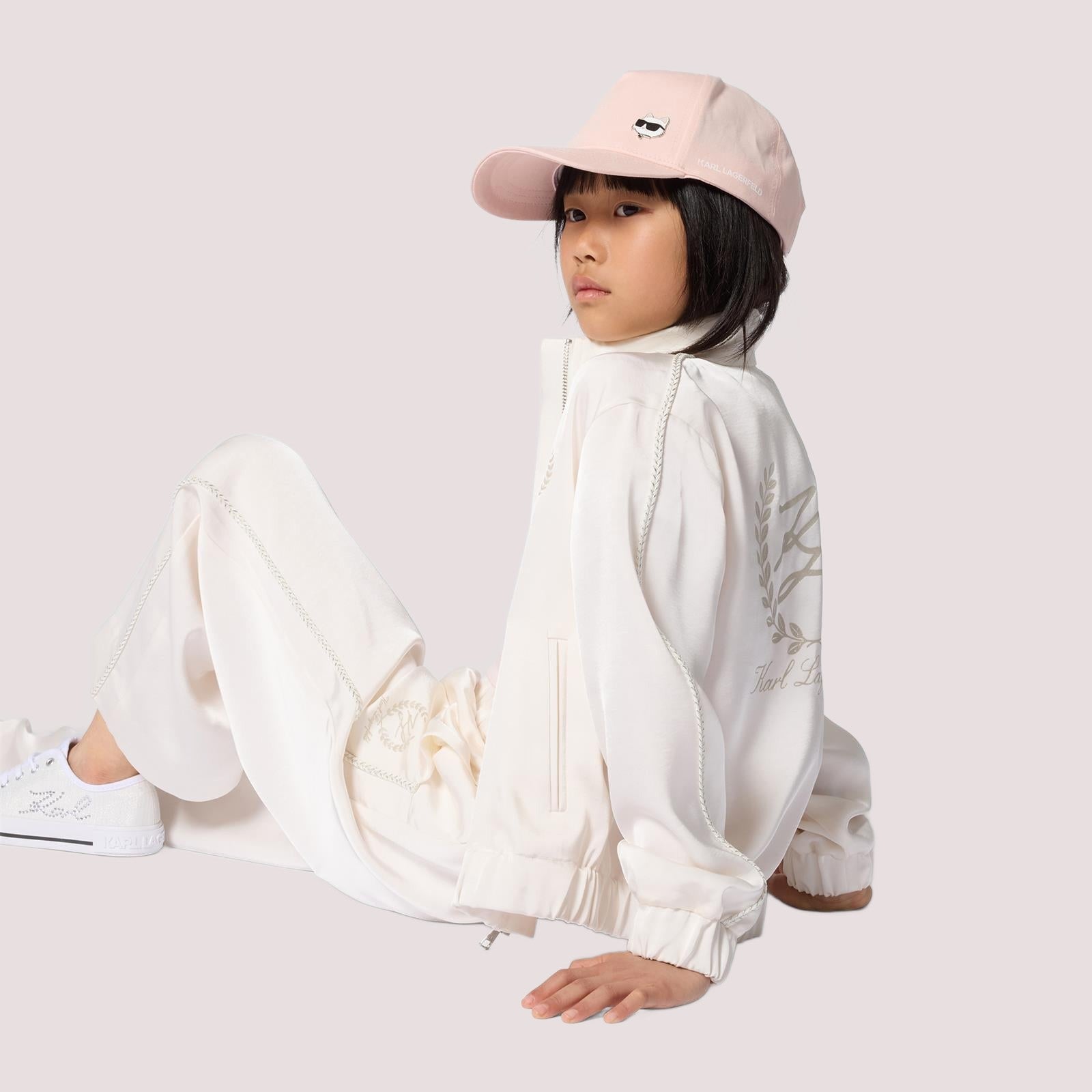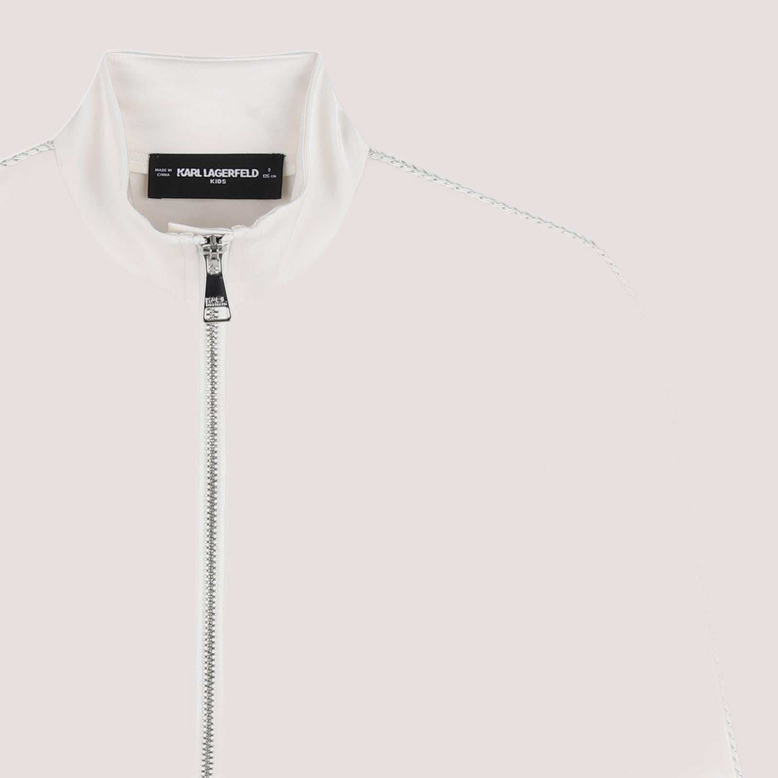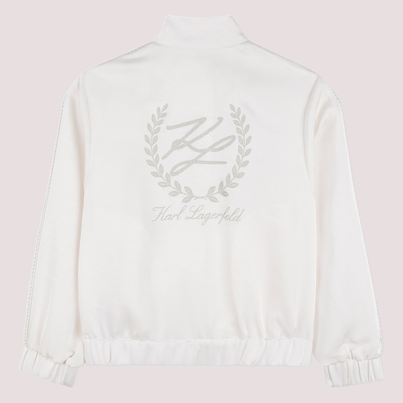 Cardigan in raso (PL). Chiusura con cerniera. Due tasche anteriori. Treccia lungo le maniche. Illustrazione KL sul petto in inchiostro glitterato.