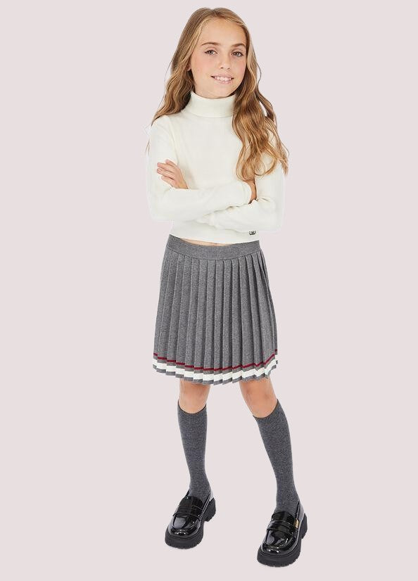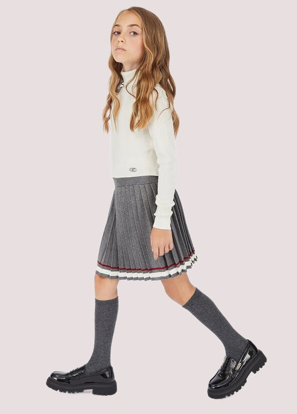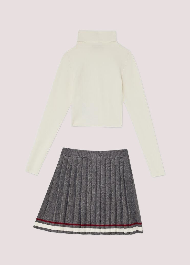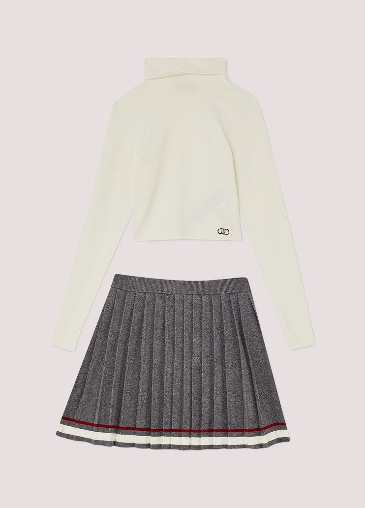 Completo Liu Jo composto da una maglia a collo alto, a maniche lunghe e dal taglio aderente, abbinata a una gonna a pieghe con fascia decorativa sul bordo inferiore.