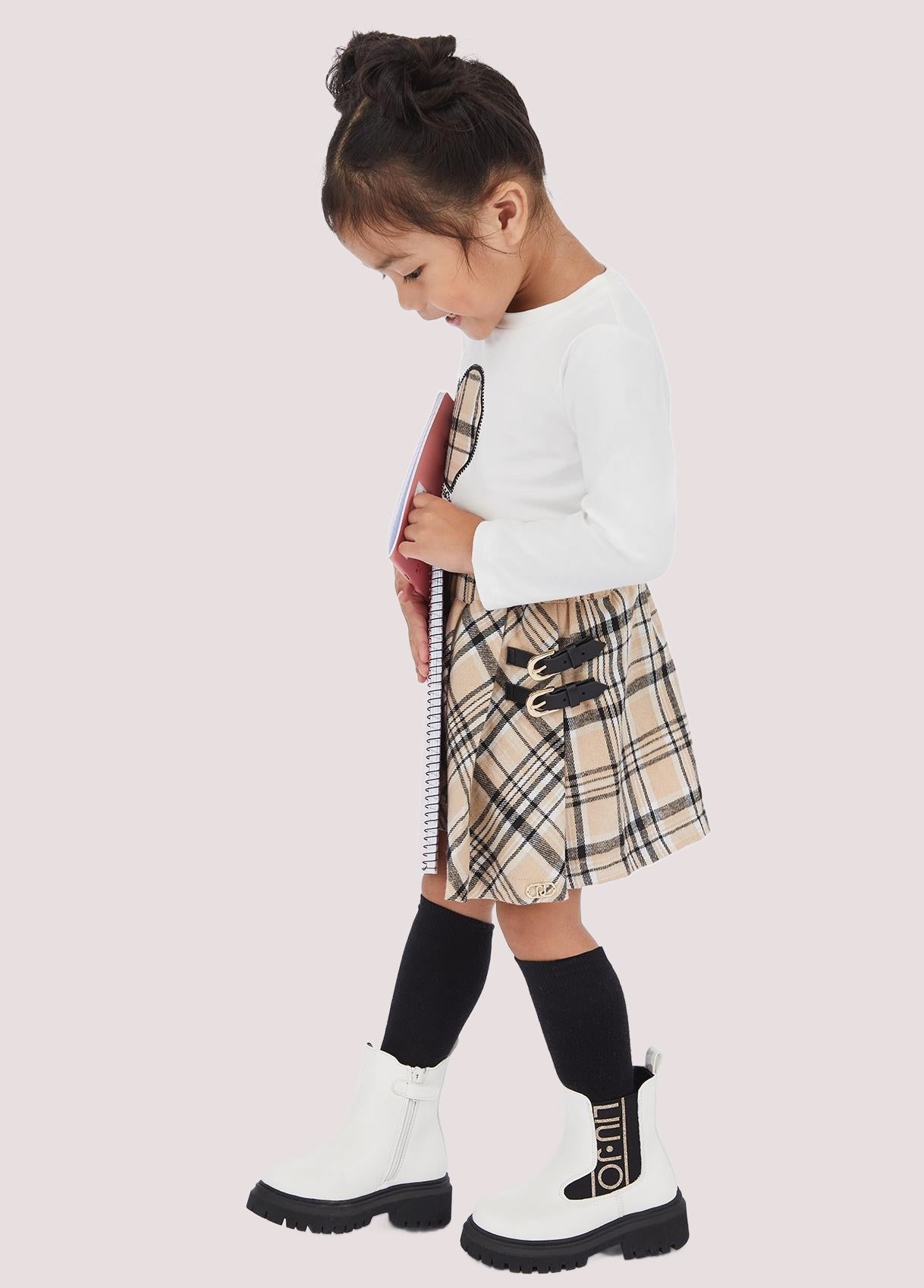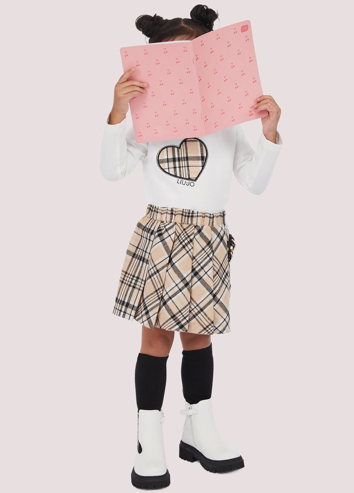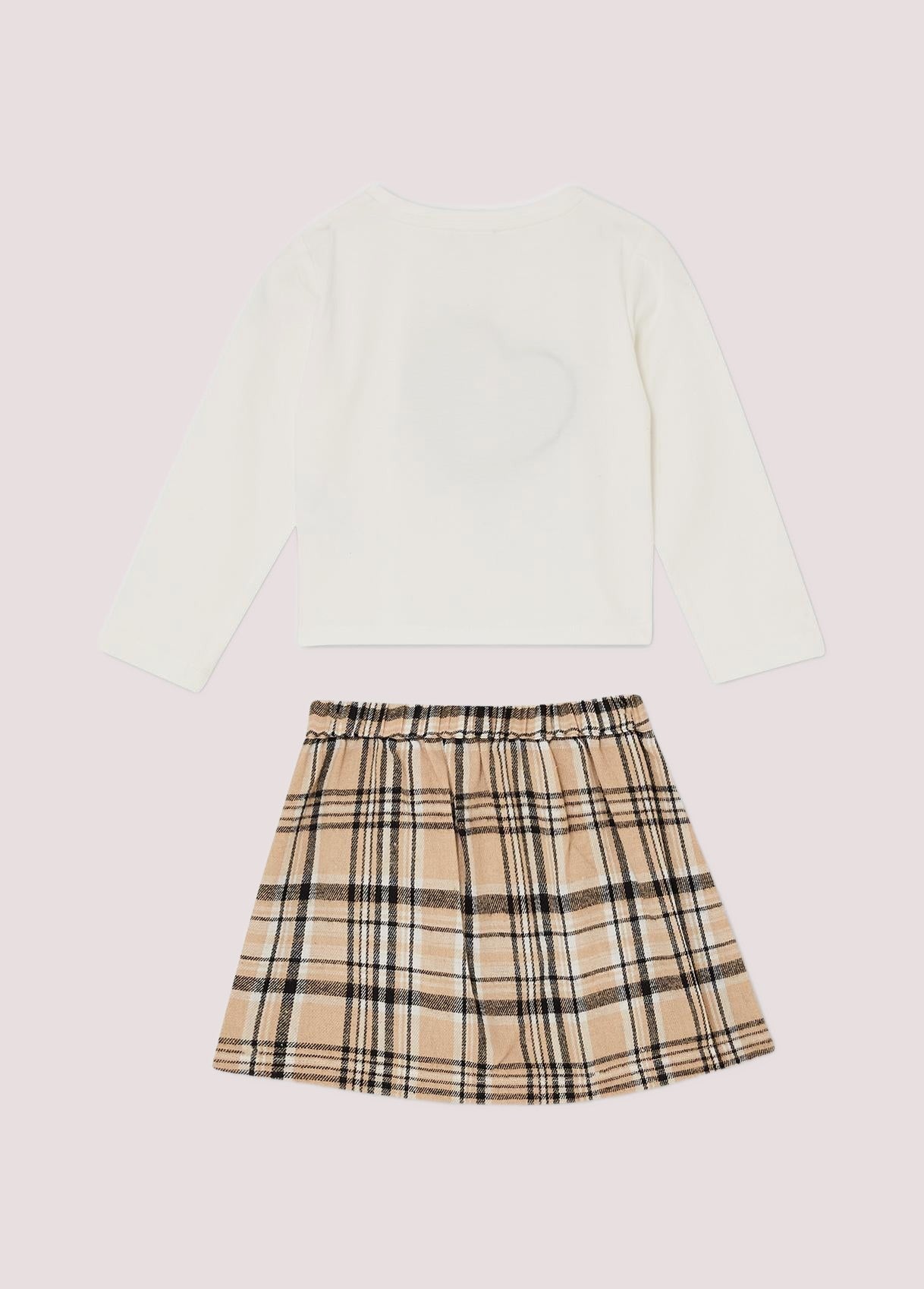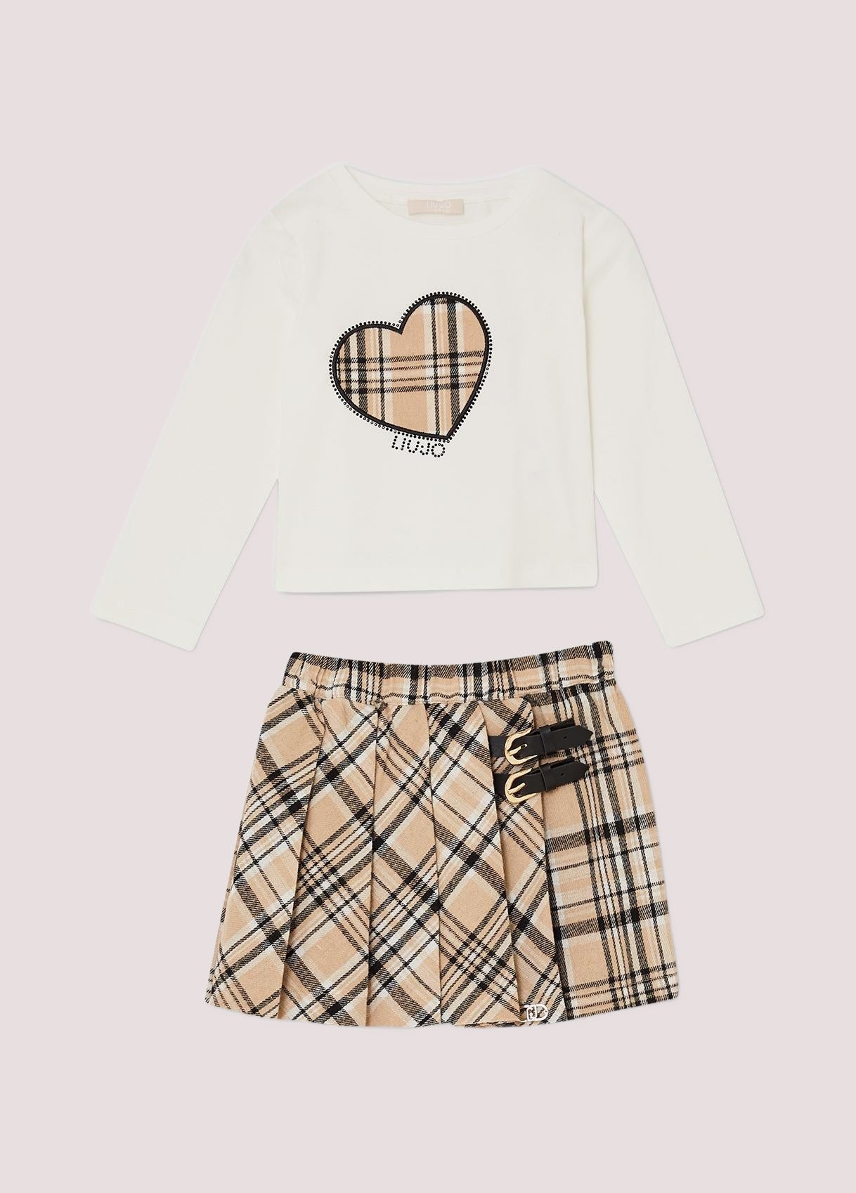 Completo da bambina in misto cotoneCuore check con logoTaglio girocolloManiche lungheGonna check a pieghe con cintone elastico e cinturiniLogo in metallo