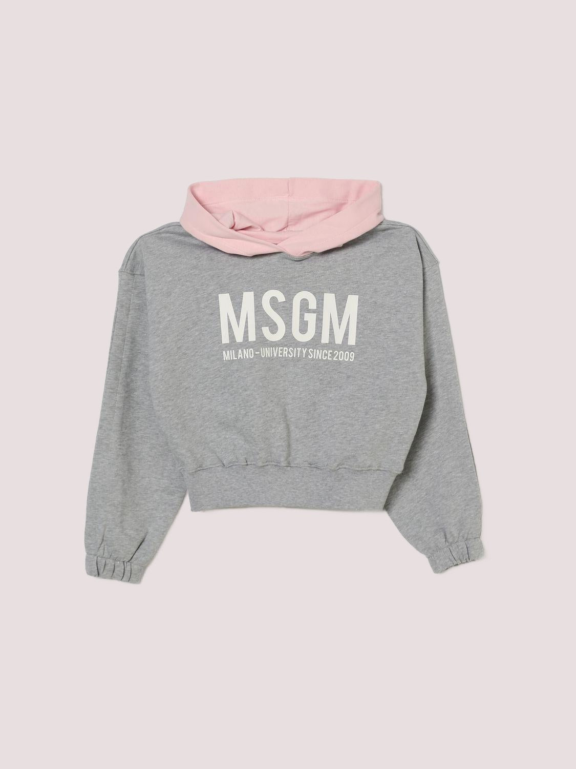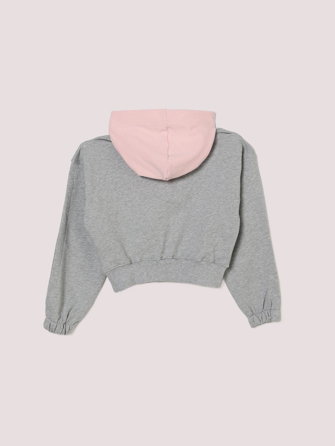 Felpa con cappuccio in cotone garzato MSGM Kids in tonalità grigio melange con interno rosa a contrasto. Modello cropped dalla linea morbida, con spalle leggermente scese e maniche voluminose che terminano in polsini elasticizzati. Sul davanti maxi logo MSGM stampato in bianco che richiama il carattere grafico del brand. Fondo rifinito con fascia aderente che valorizza il volume del corpo e delle maniche.Made in Italy.Composizione: 100% CotoneCura del capo: Lavare in lavatrice a 30°