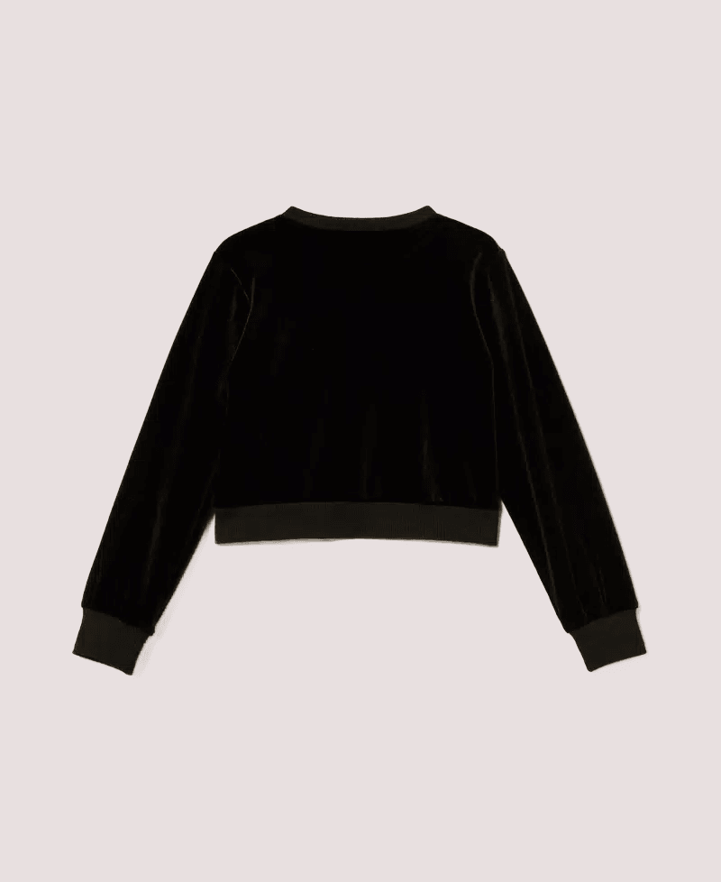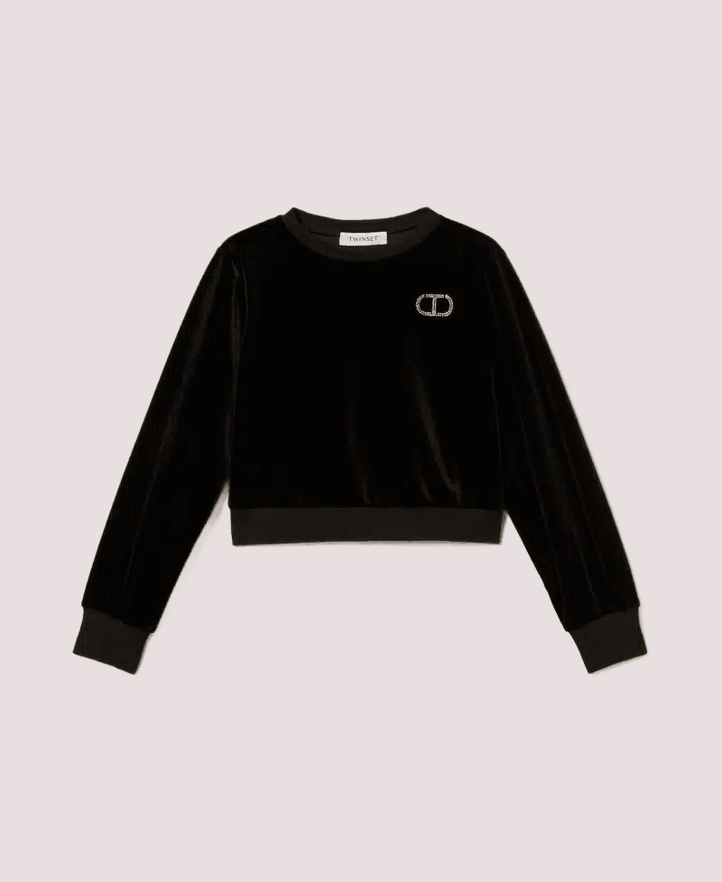 Felpa da bambina in ciniglia con logo Oval T in strass termoadesivi. Ha collo tondo, maniche lunghe, finiture a costine, linea slim.