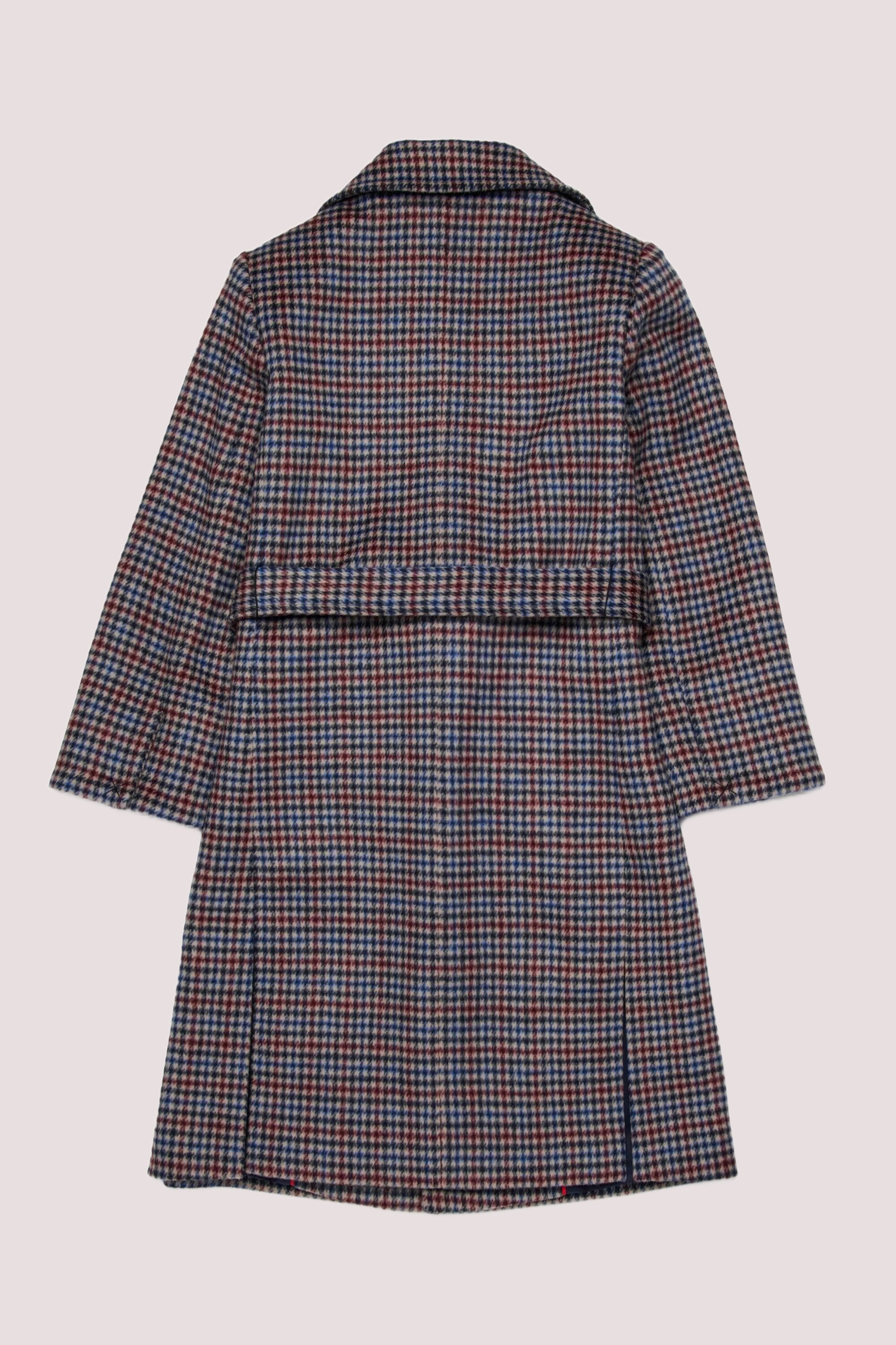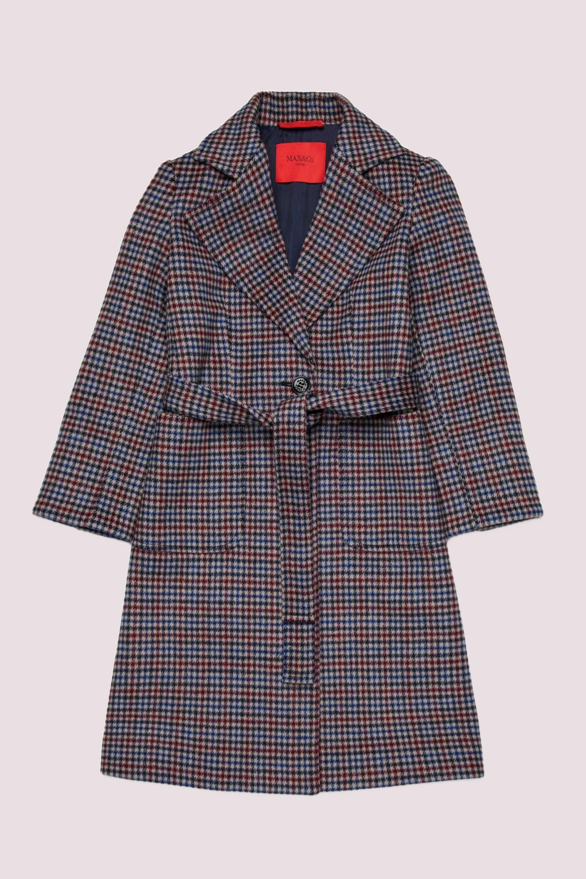 Cappotto grigio pied de poule in lana, a maniche lunghe, con colletto a revers, chiusura frontale bottone, cintura in vita e tasche applicate sulla parte anteriore.