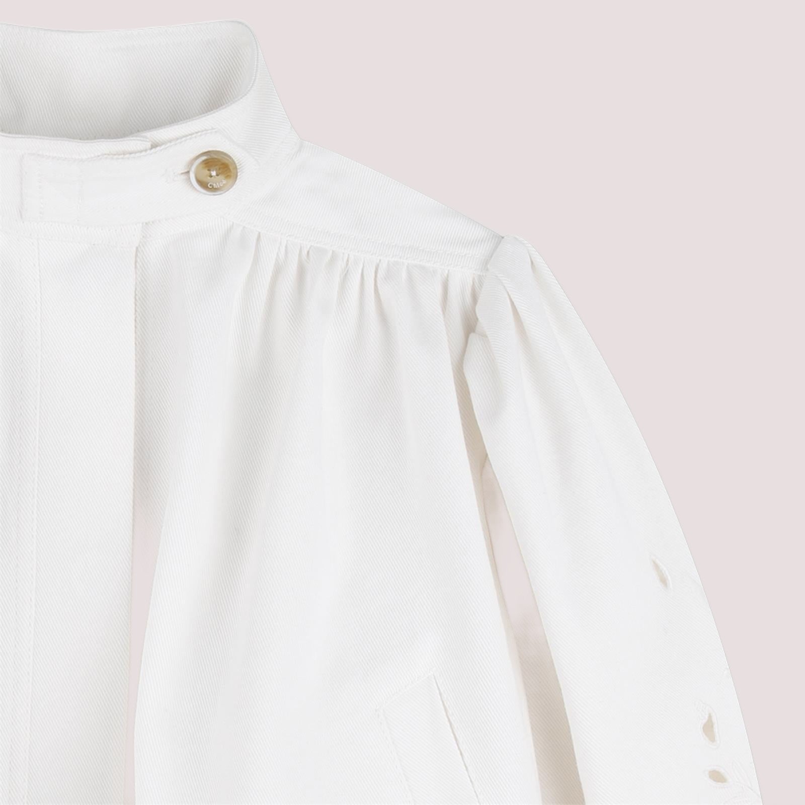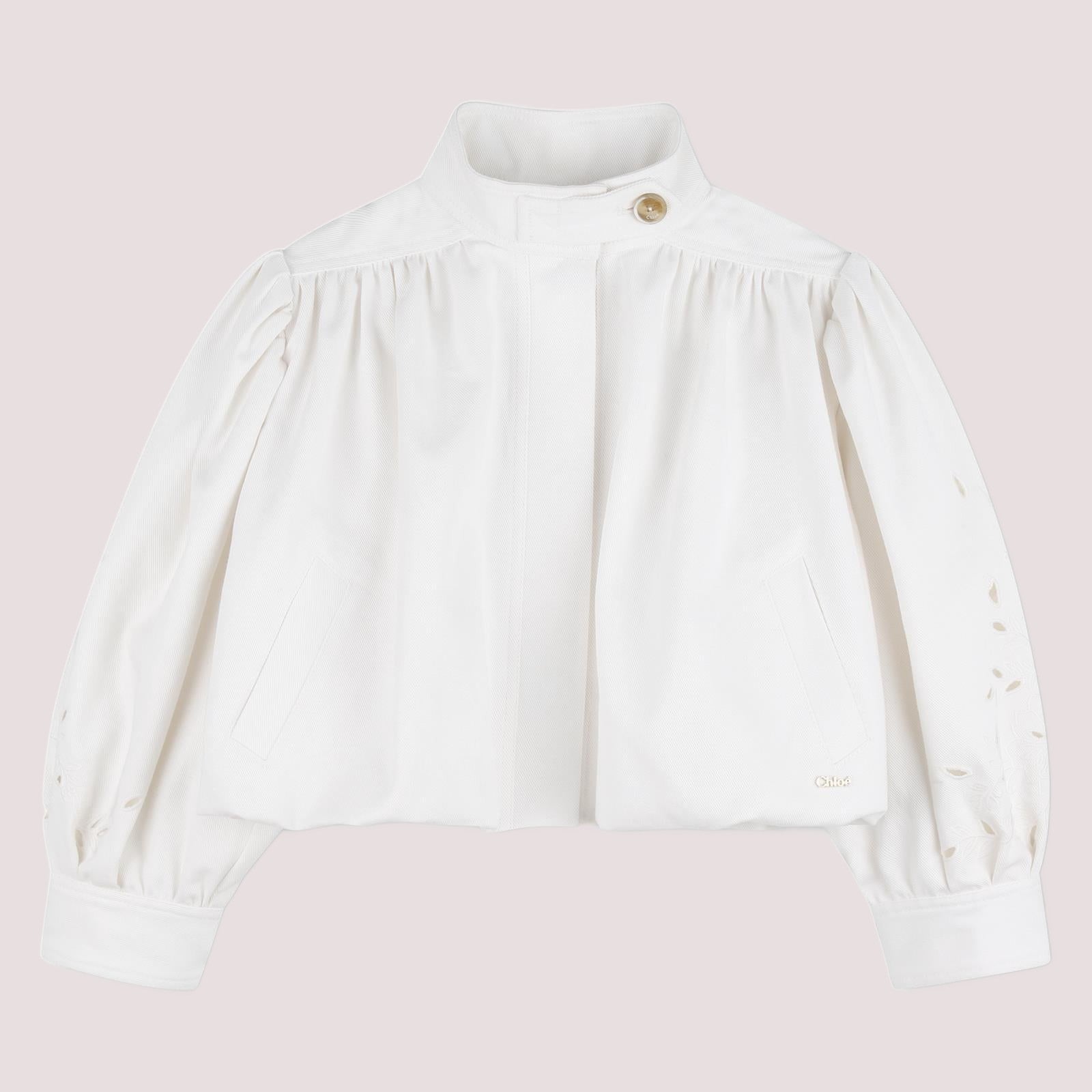 Giacca in twill di cotone proveniente da agricoltura biologica con ricami floreali traforati, forma a palla, placca in metallo dorato Chloé sul davanti. Ispirata all'abbigliamento femminile.