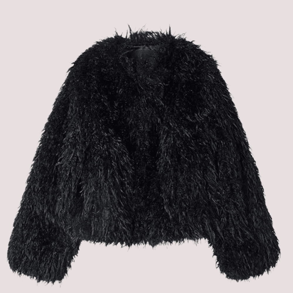 Ecopelliccia effetto mongolia nera . Caratterizzata da collo tondo, chiusura frontale con bottoni a pressione, maniche lunghe e orlo dritto.