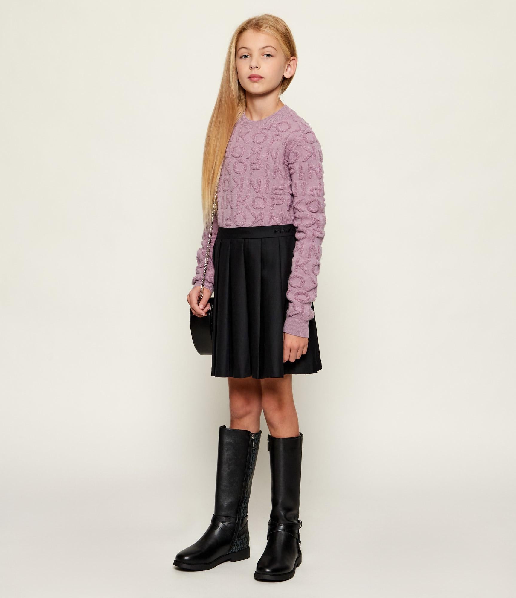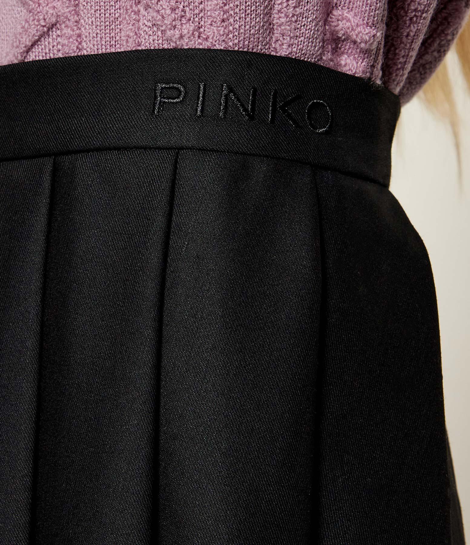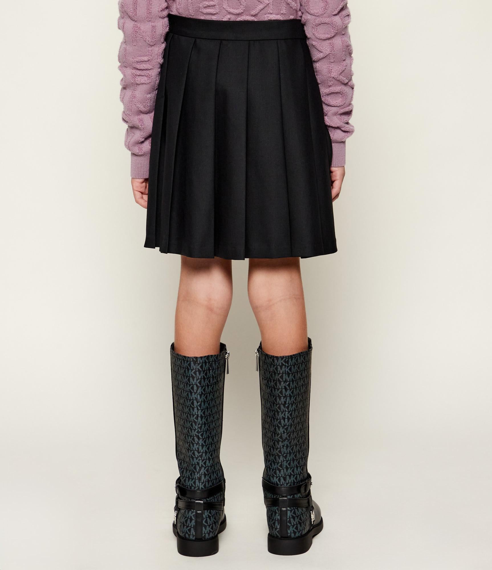 Gonna a pieghe di colore nera , con logo ricamatoe chiusura con zip laterale nascosta.