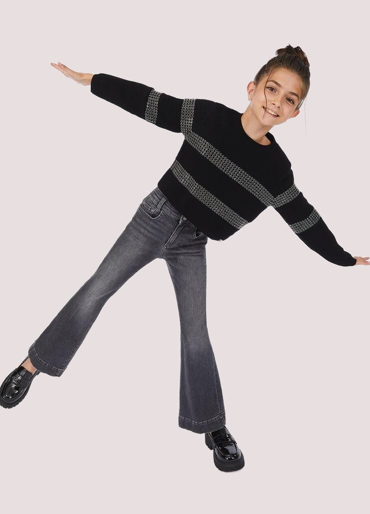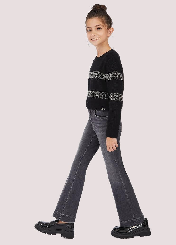 Jeans Liu Jo dal modello bootcut, presenta una linea dritta sulla coscia che si apre leggermente dal ginocchio in giù, creando una gamba ampia sul fondo. La vita è di altezza media, con passanti per cintura e una chiusura a bottone con zip, è dotato di cinque tasche, il tessuto denim è elasticizzato, con un leggero effetto slavato sia sul fronte che sul retro.