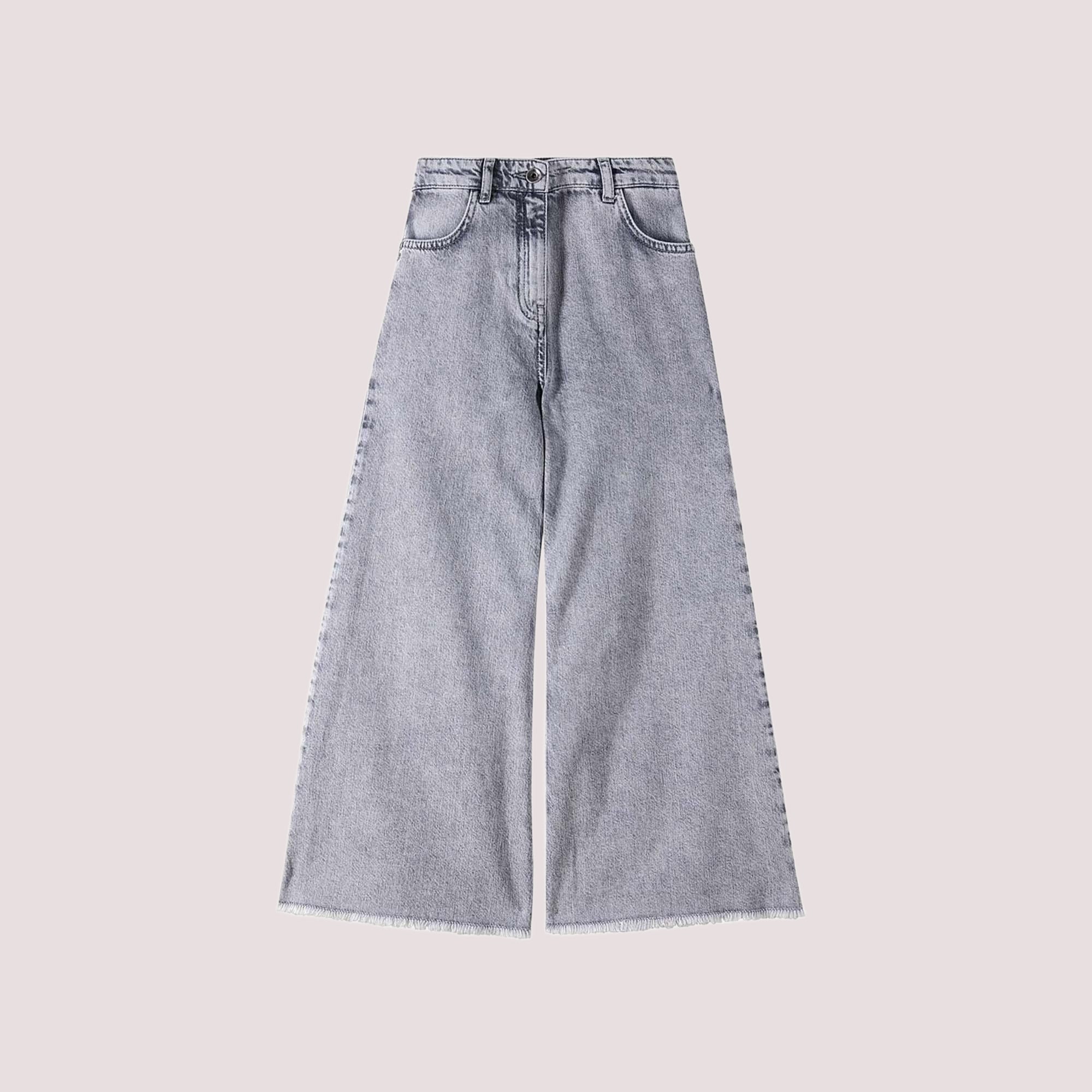 Jeans a gamba larga e svasata con orlo sfrangiato, sono realizzati in denim grigio. La tasca posteriore è impreziosita da un papillon ricamato. Hanno vita regolare.
