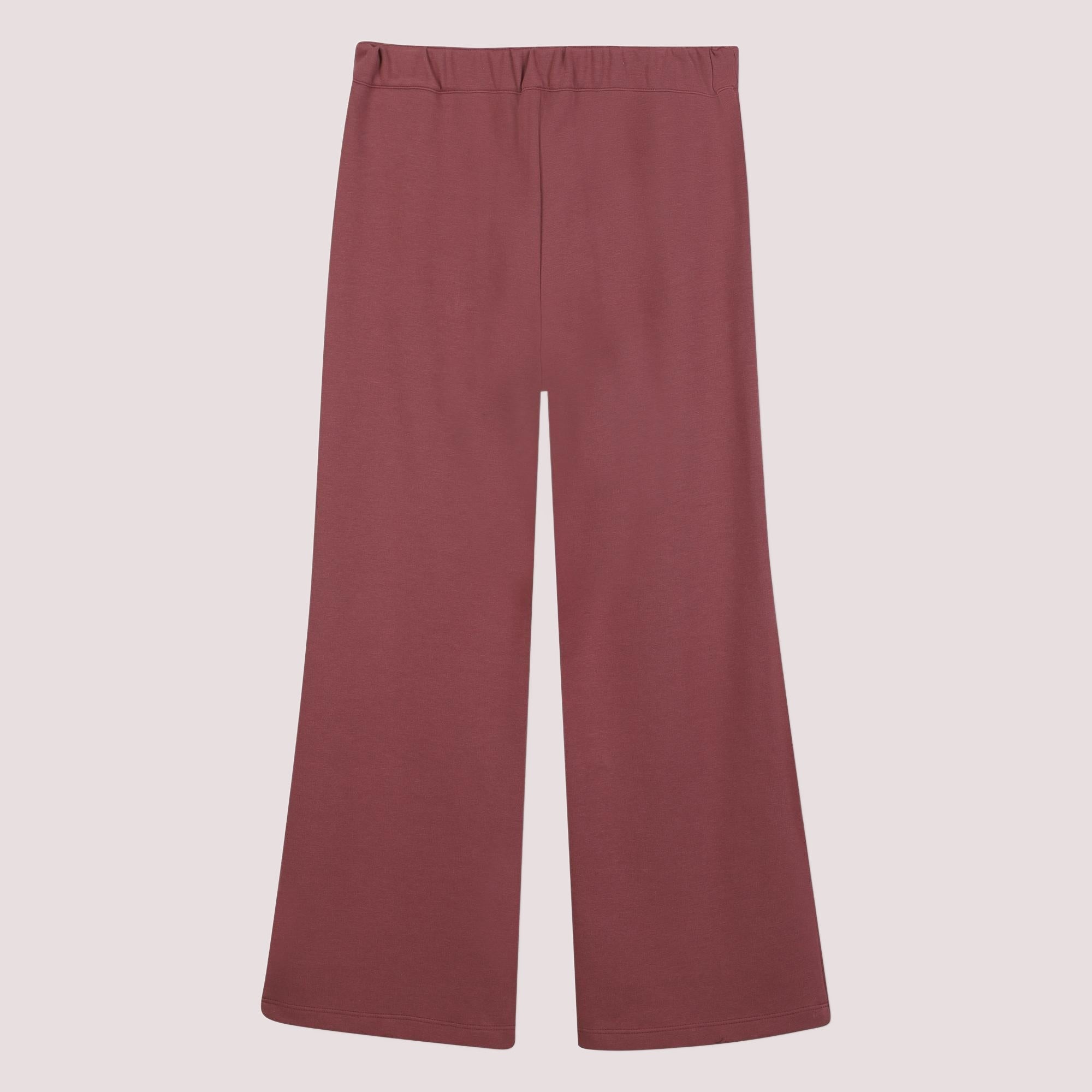 Pantalone rosa scuro, con pieghe sul davanti, vita elasticizzata e tasche laterali.
