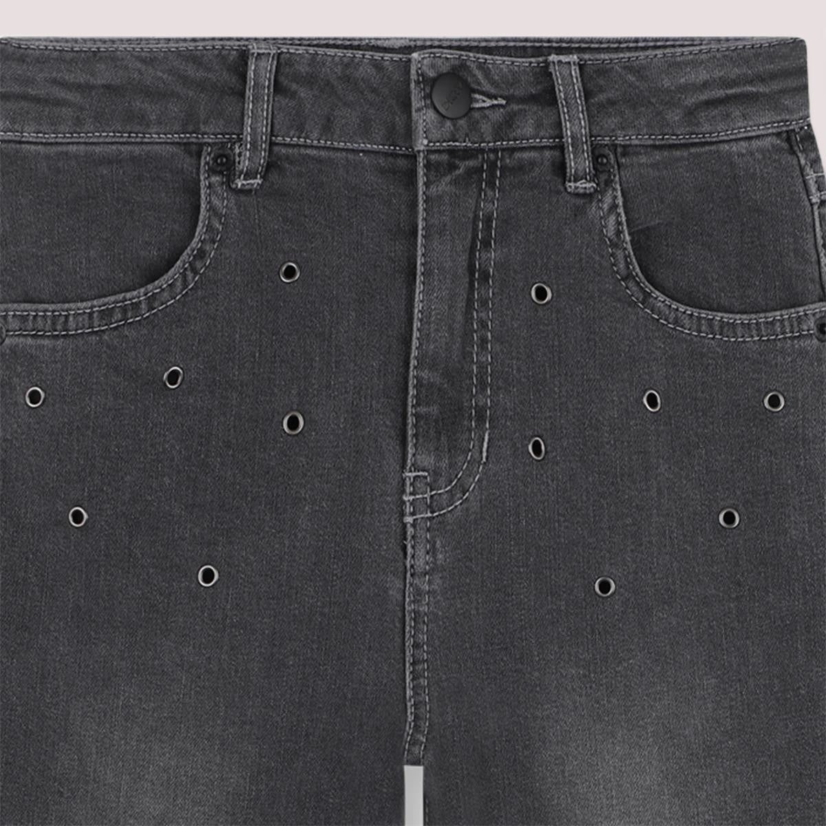Pantalone in denim, ispirata alla collezione per adulti, in denim di cotone elastan (99%CO, 1%EA). Tasche anteriori e posteriori. Dettaglio di occhielli metallici sul davanti. Logo Mini-me DKNY Heart of NY ricamato in argento sulla tasca posteriore. Vita regolabile fino a 10 anni.