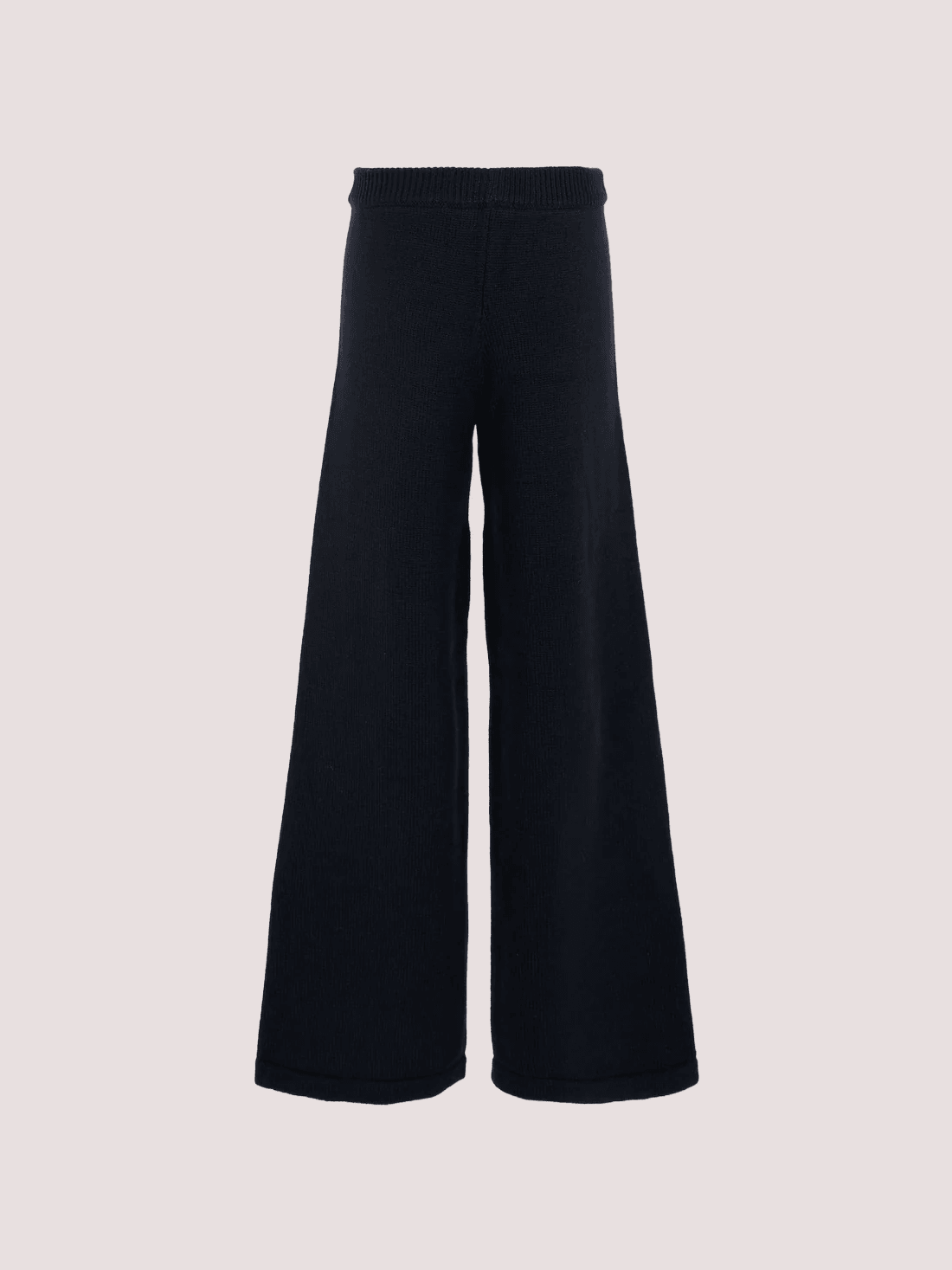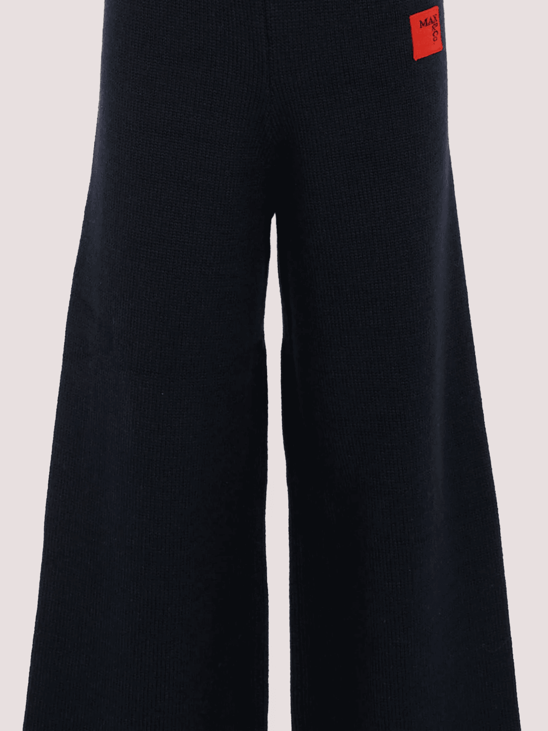 Pantaloni blu in maglia, con vita elasticizzata costine. È decorato con patch logato sulla parte anteriore.