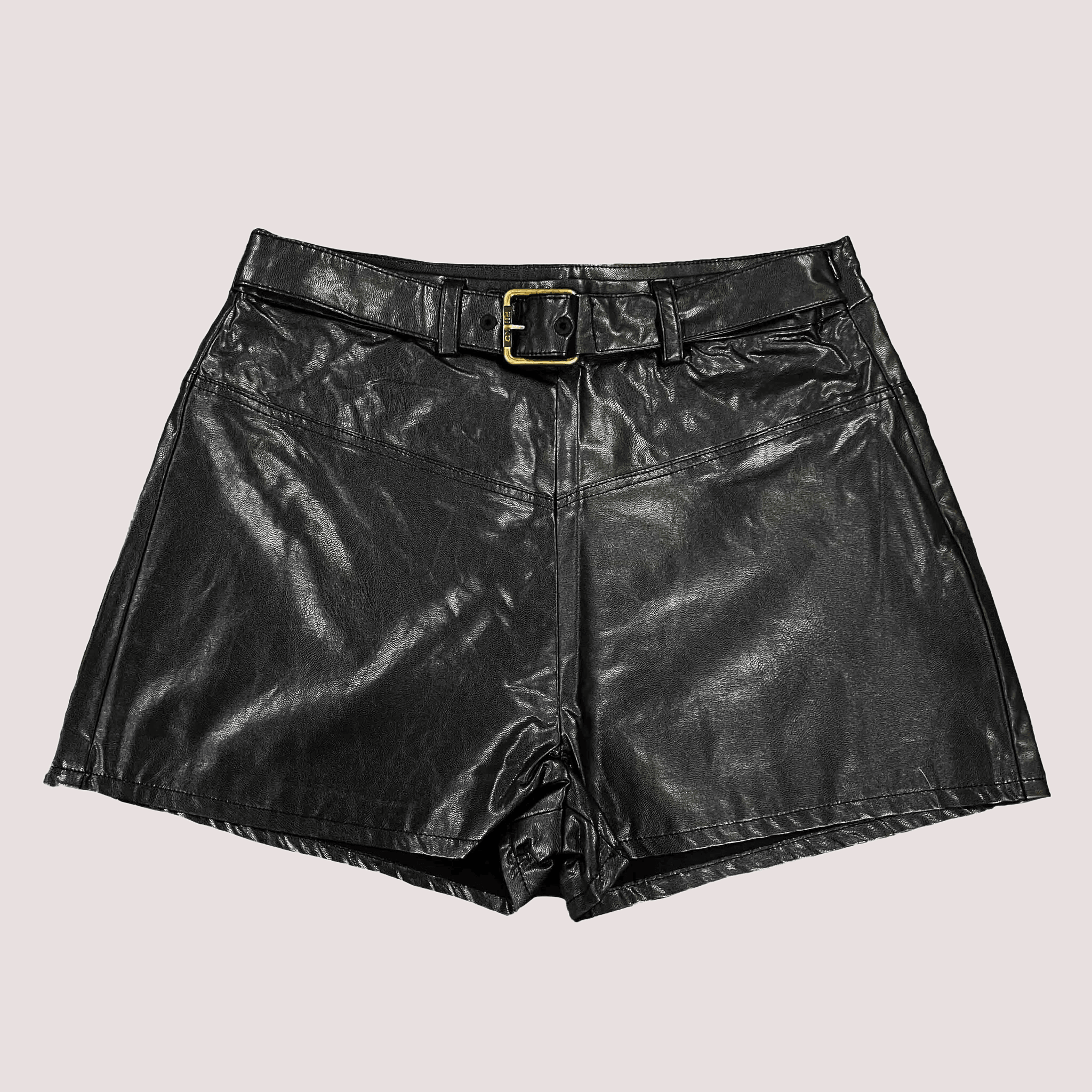 Shorts di colore nero, realizzati in similpelle con una leggera lucentezza, per un look alla moda e di tendenza. Una cintura coordinata nello stesso materiale si trova in vita, consentendo una vestibilità regolabile e valorizzante. Il materiale morbido e flessibile offre comfort e libertà di movimento.