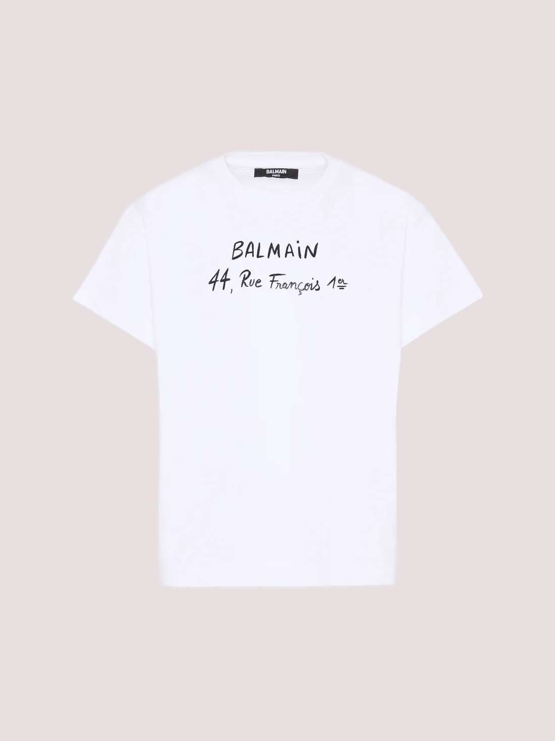 T-shirt realizzata in cotone organico, con maniche corte, girocollo e spacchi laterali. È decorata con stampa logo Balmain e scritta 44, rue François 1er sulla parte anteriore.