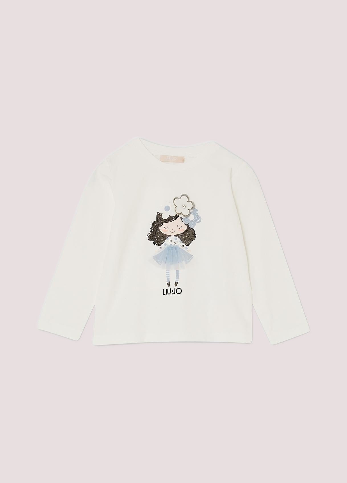 T-shirt in jersey di cotone stretchStampa grafica con strass e logoTaglio girocolloManiche lunghe