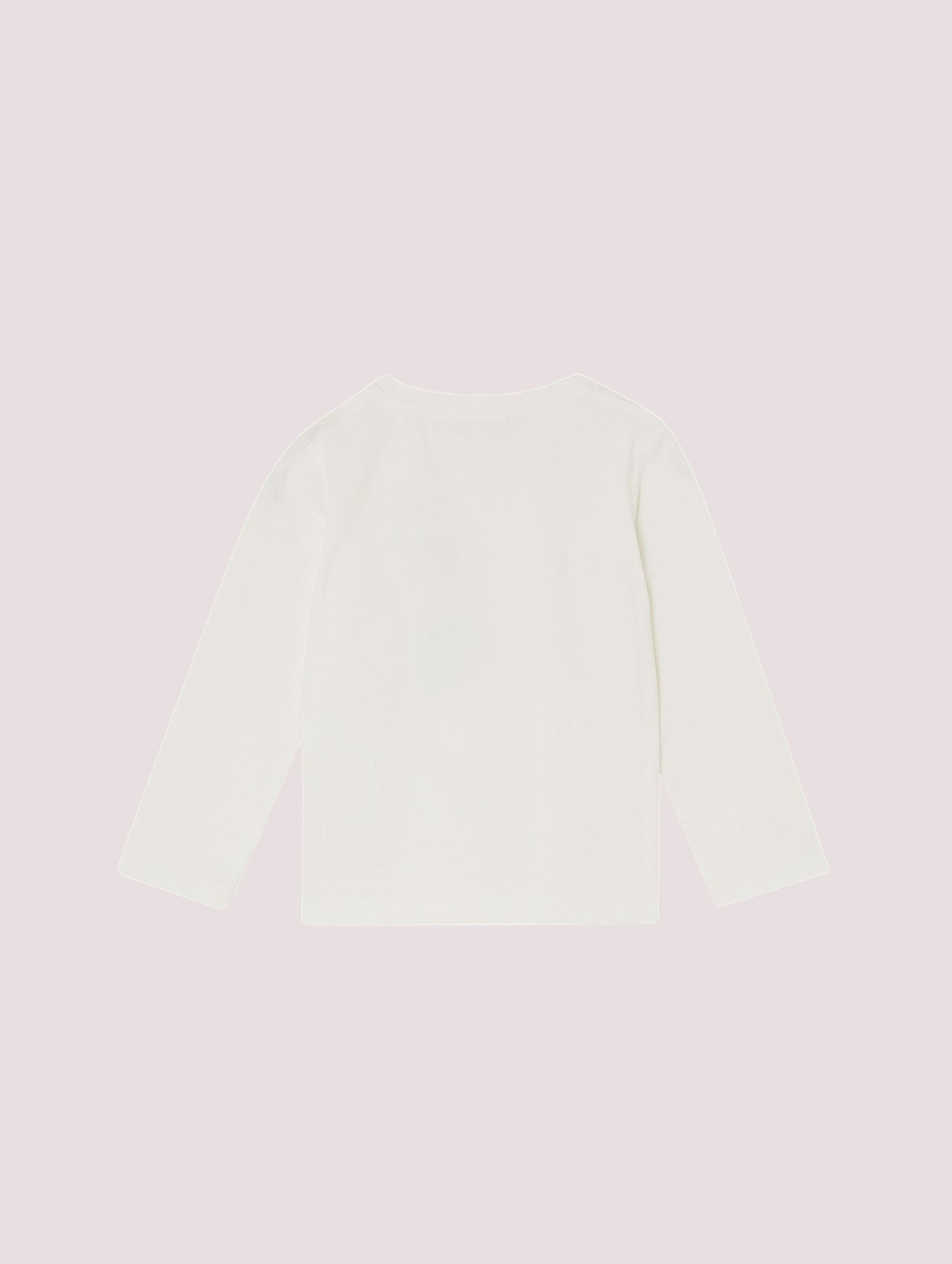 T-shirt in jersey di cotone stretch, a maniche lunghe, con scollo rotondo, a tinta unita, con stampa grafica con logo, strass e fiocchetto sul davanti. Per un look trendy e chic.