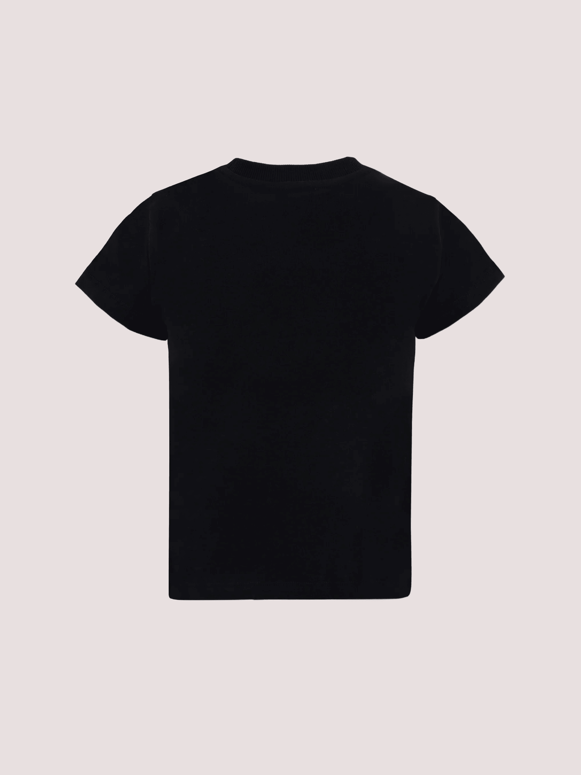 T-shirt nera del brand Moschino Kids, realizzata in misto cotone pesante, con maniche corte e girocollo a costine. È decorata con stampa Teddy Bear e fiocco di paillettes, sulla parte anteriore.