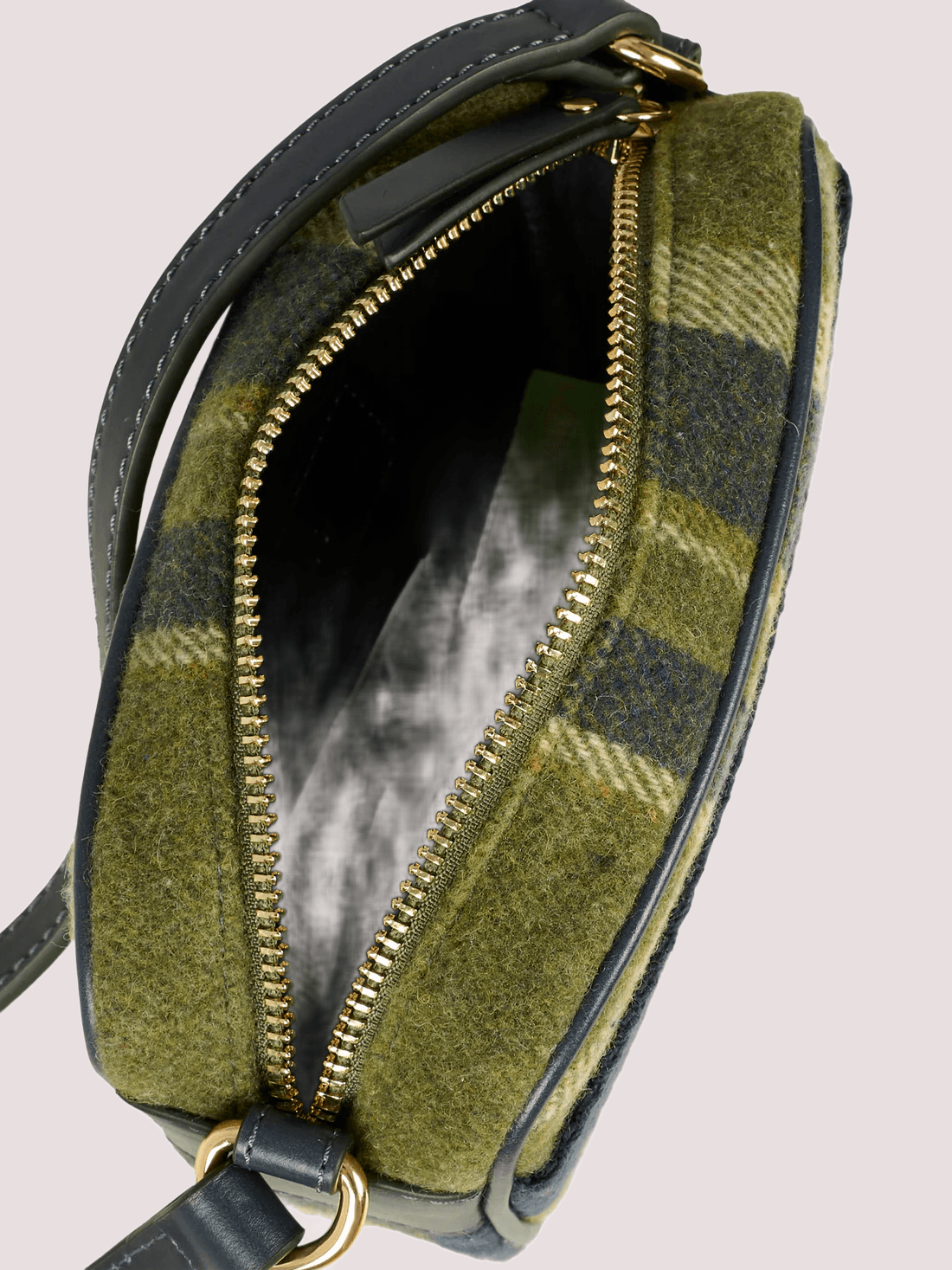 Borsa verde a quadri, con tracolla blu regolabile, zip superiore e tasca frontale. È decorata con fascia blu e logo ricamato sulla parte anteriore. Dimensioni (L x A x P): 17,5cm x12cm x6cm