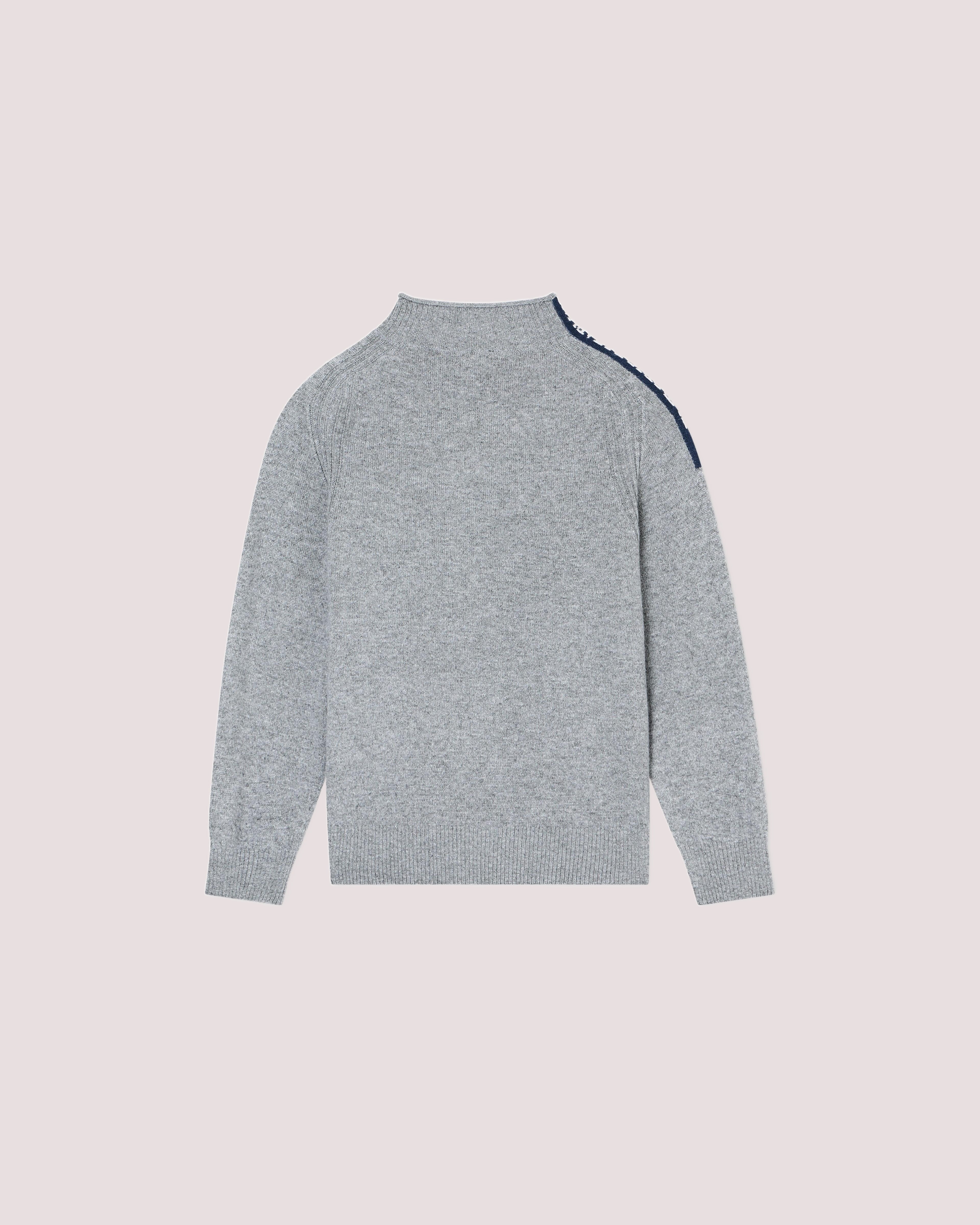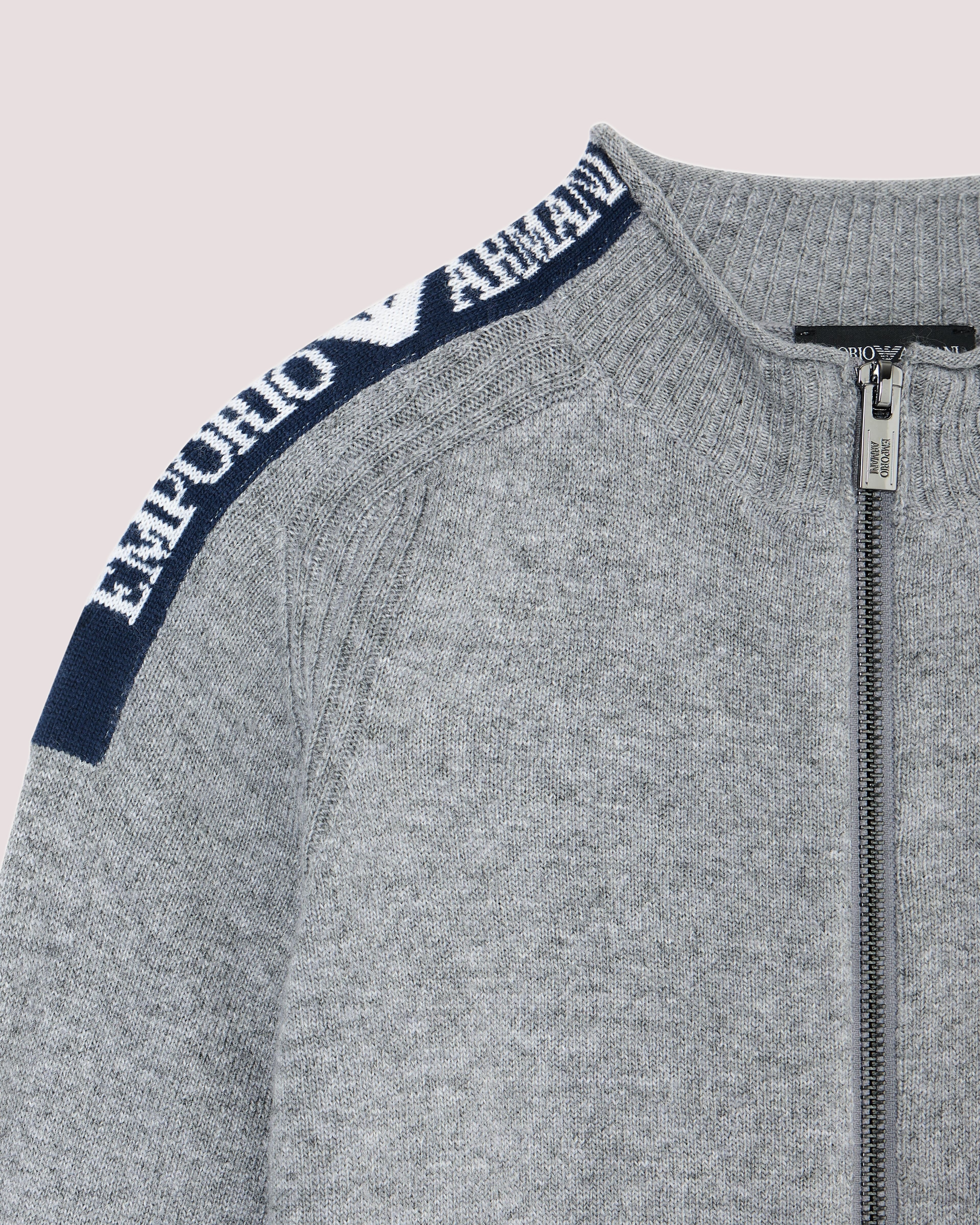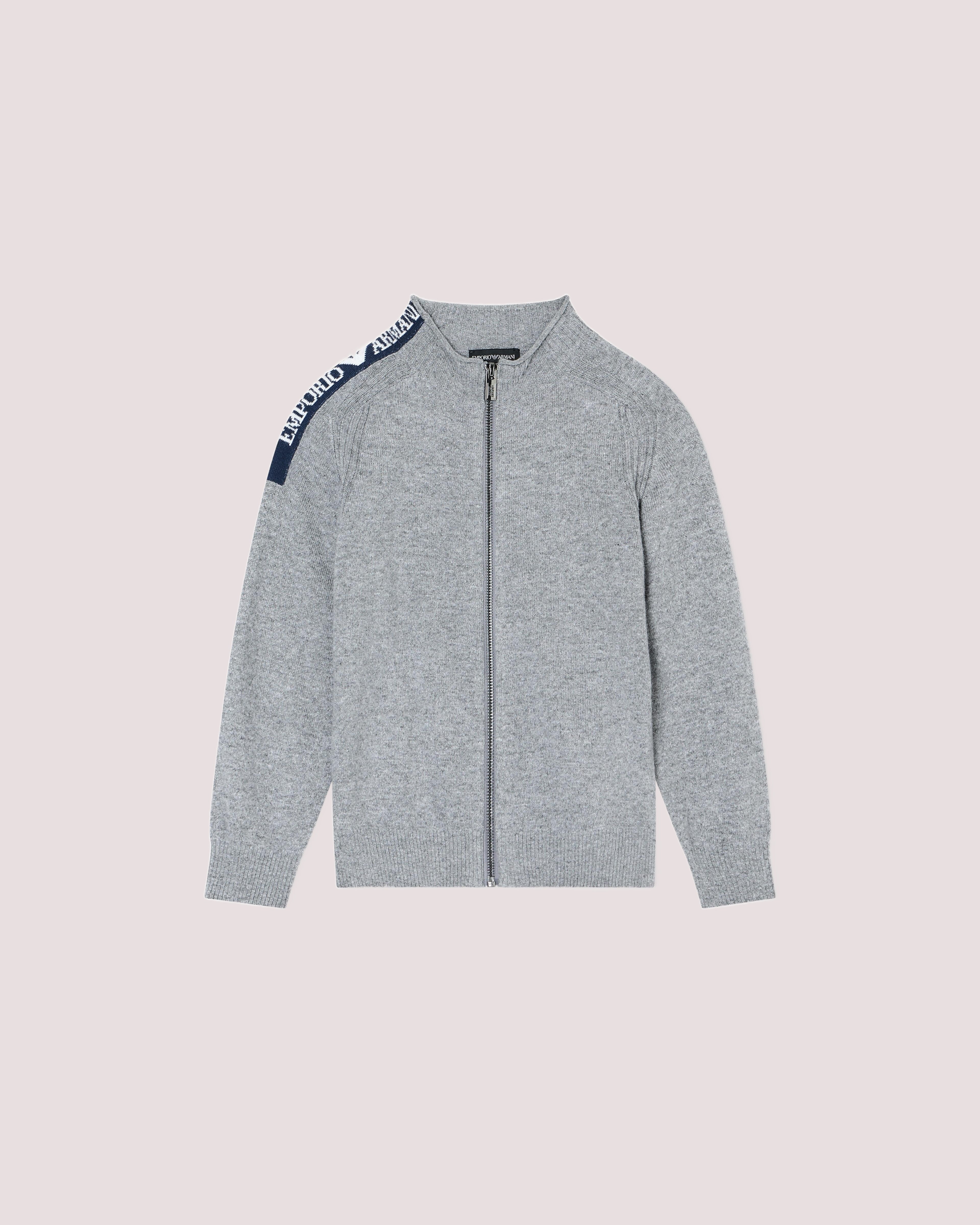 Cardigan di colore grigio, chiusura con zip, polsini a coste, maniche lunghe, dettaglio con logo.