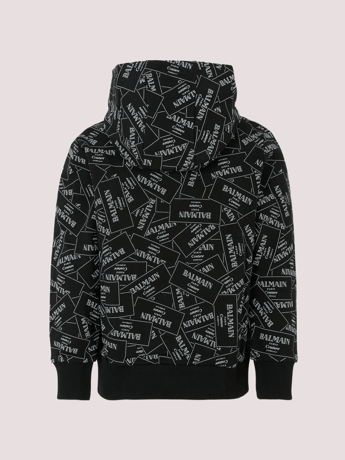 Felpa nera in cotone organico garzato, a maniche lunghe, con cappuccio, polsini e orlo a costine. È decorata con stampa logo Balmain Couture all-over.Composizione: 100%cotone Organico