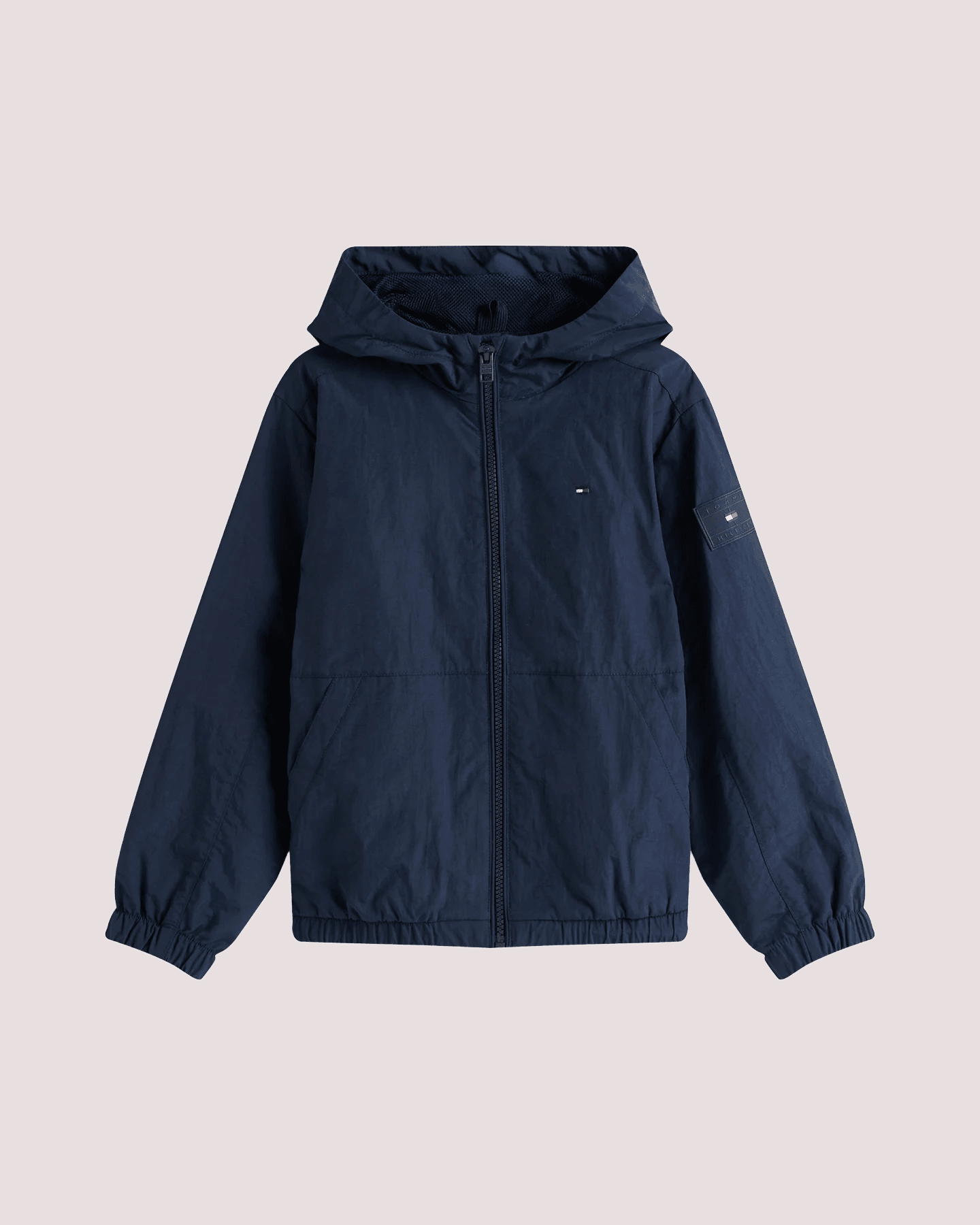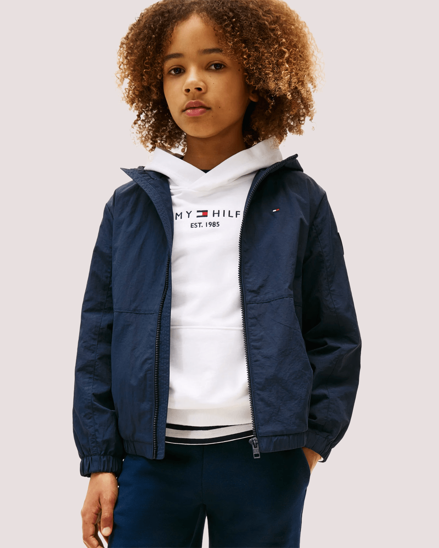 Giacca leggera con cappuccio caratterizzata da chiusura frontale con zip e tasche laterali. Dotata di polsini elasticizzati e logo sul petto, offre una vestibilità pratica e confortevole. Perfetta per completare look quotidiani nelle mezze stagioni.