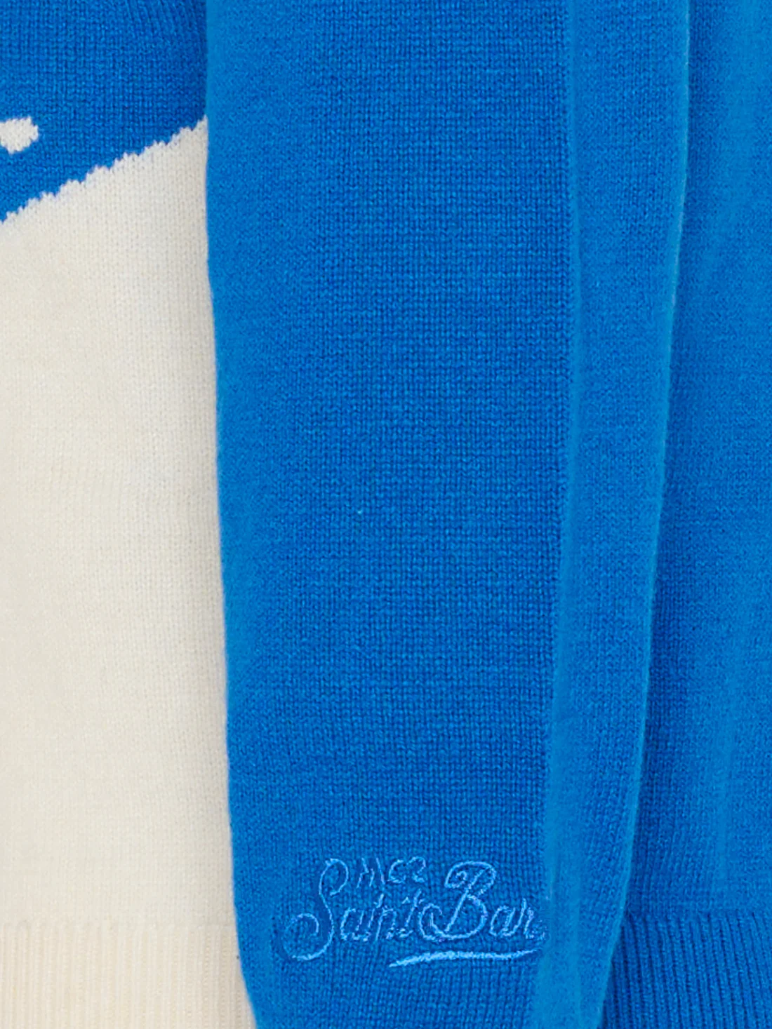 Maglione azzurro a maniche lunghe, con girocollo, polsini e orlo a costine; nella taglia 2 anni presenta bottoni sulla spalla. È decorato con Topolino ad intarsio sulla parte anteriore e logo ricaamto sulla manica. È una collaborazione Disney x Mc2 Saint Barth.Composizione: 40%lana - 25%viscosa - 25%poliammide - 10%cashmere