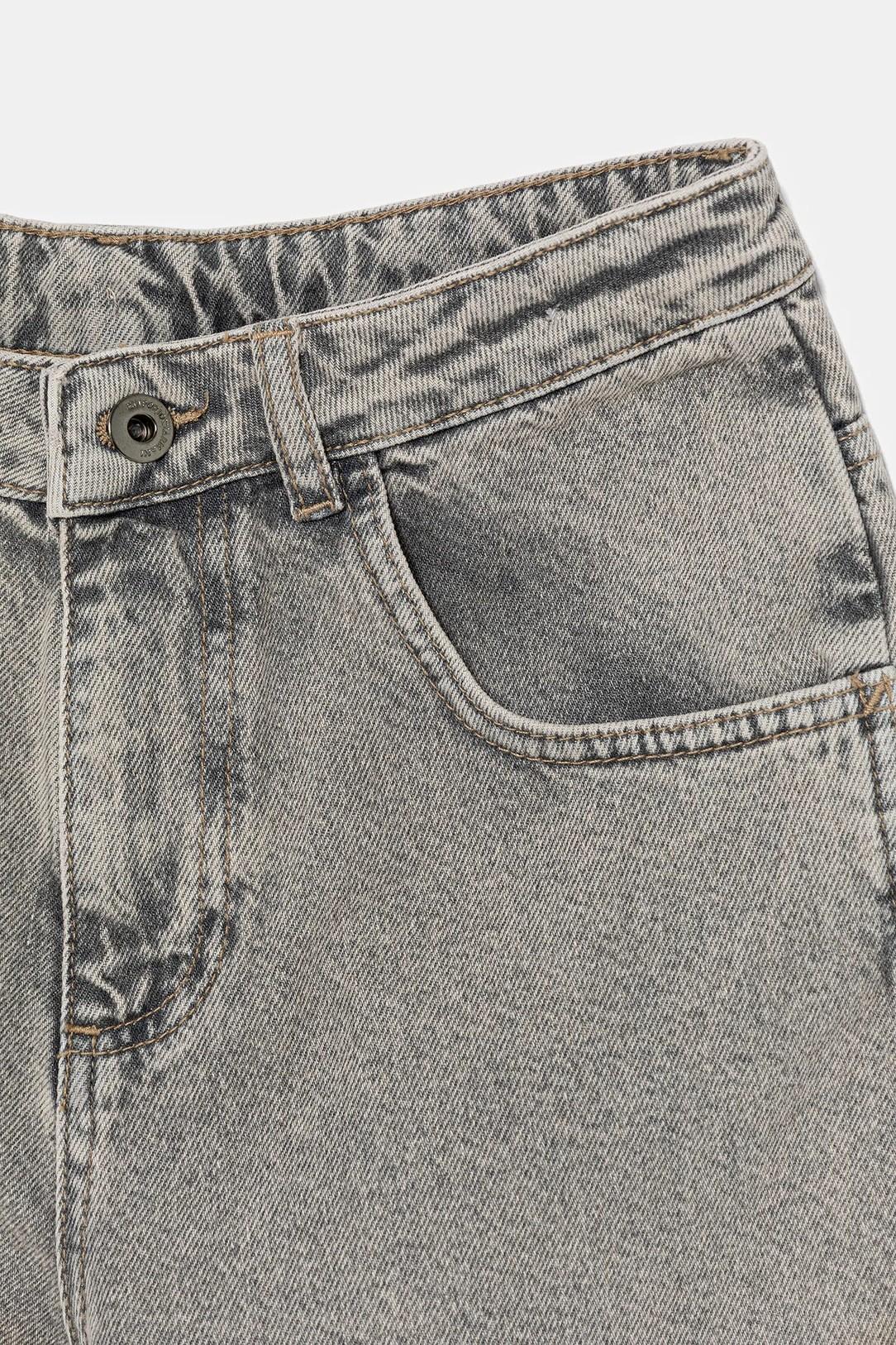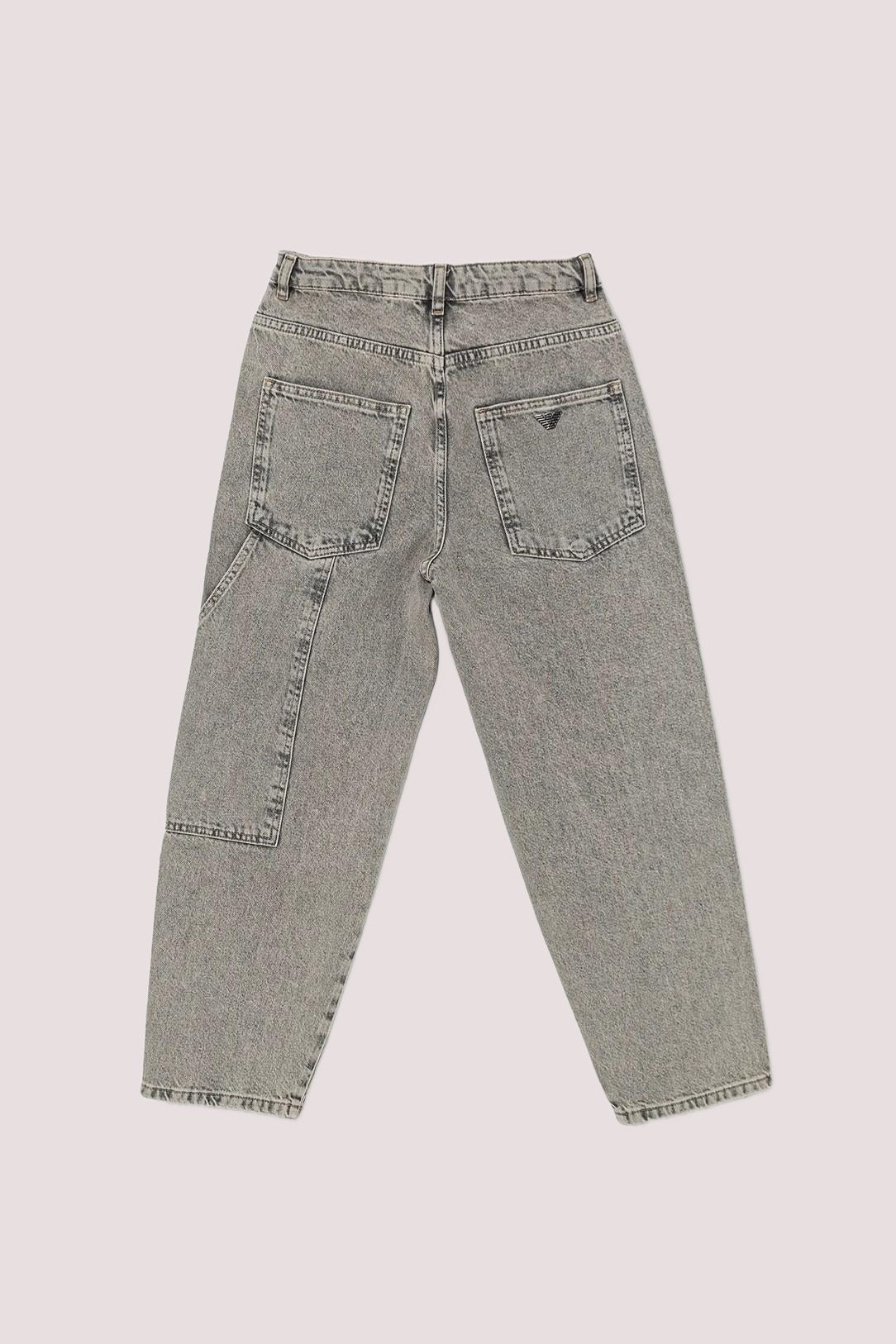 Jeans 5 tasche di colore grigio, tasche anteriori applicate, tasche posteriori applicate, patta con bottoni.