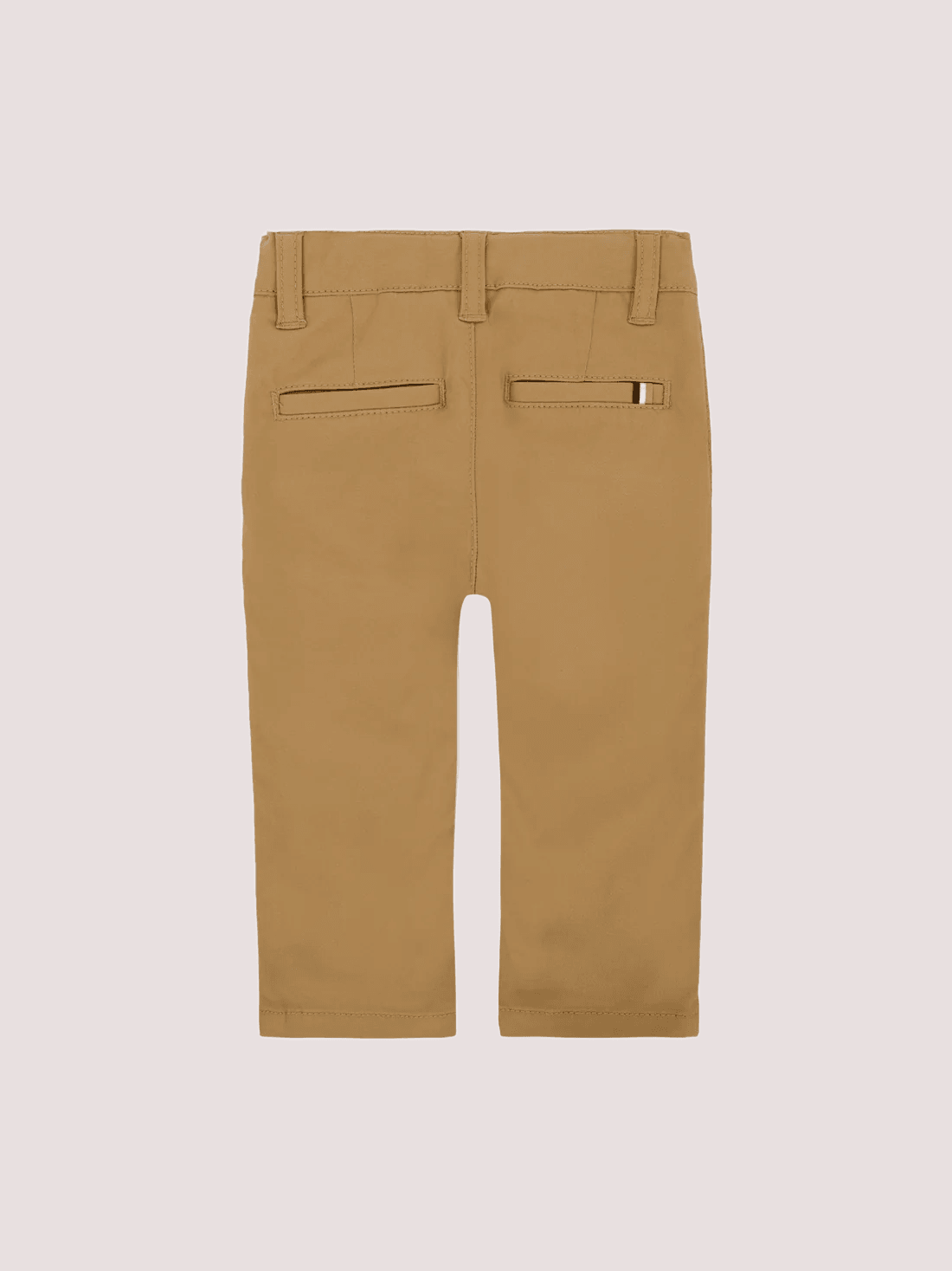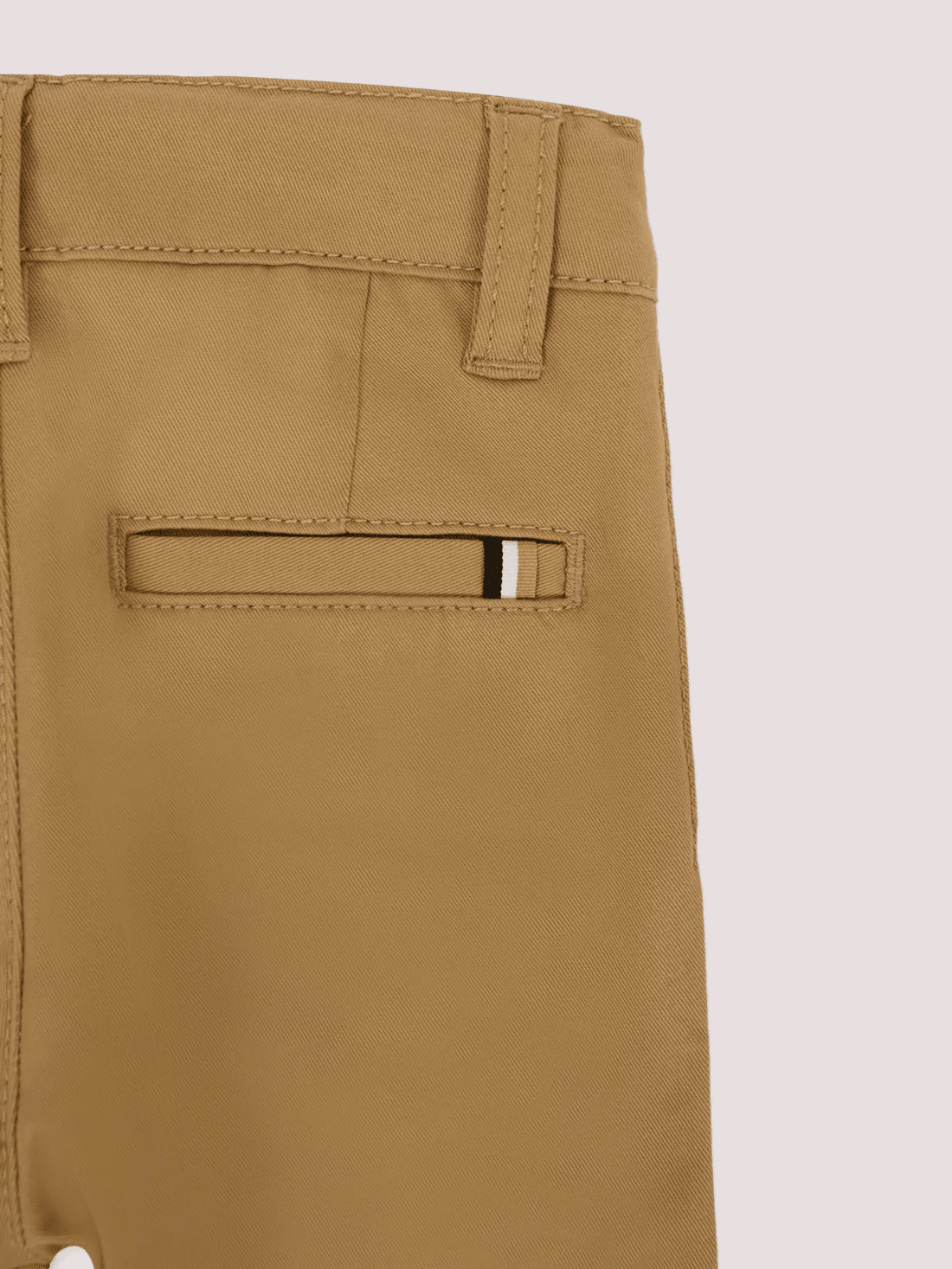 Pantaloni beige realizzati in cotone, con tasche laterali, passanti per cintura, chiusura con gancio e zip sulla parte anteriore, vita posteriore elasticizzata e tasche sulla parte posteriore. È decorato con patch sulla parte posteriore.Composizione: 98%cotone - 2%elastan
