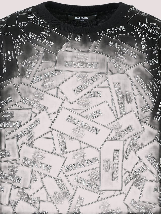 T-shirt nera in cotone organico, con maniche corte e girocollo a costine. È decorata con stampa logo Balmain Couture all-over.Composizione: 100% cotone Organico