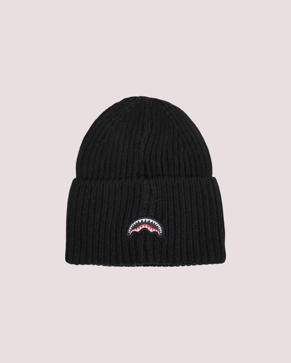 Berretto nero unisex a coste con risvolto e patch frontale rossa in ecopelle con logo Sprayground stampato. Design minimal e urbano perfetto per completare look streetwear nei mesi freddi.