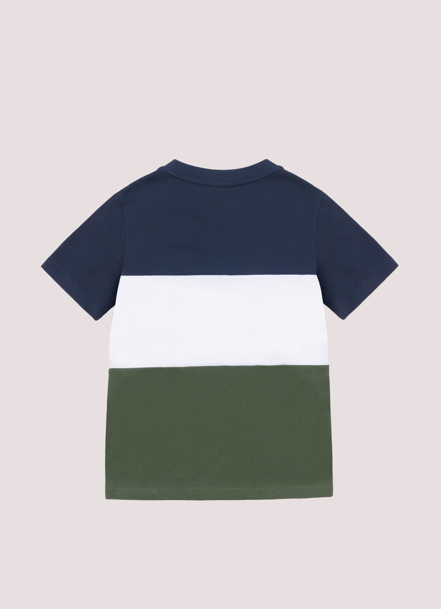 Dal carattere deciso, questa t-shirt da bambino unisce stile e comfort con la fantasia color block a tre bande orizzontali, che aggiungono dinamismo e un tocco sportivo al look. Realizzata in morbido piqué di cotone leggero, accompagna i più piccoli in ogni momento della giornata, dalla scuola ai giochi all’aria aperta, garantendo libertà di movimento e comfort in ogni avventura.