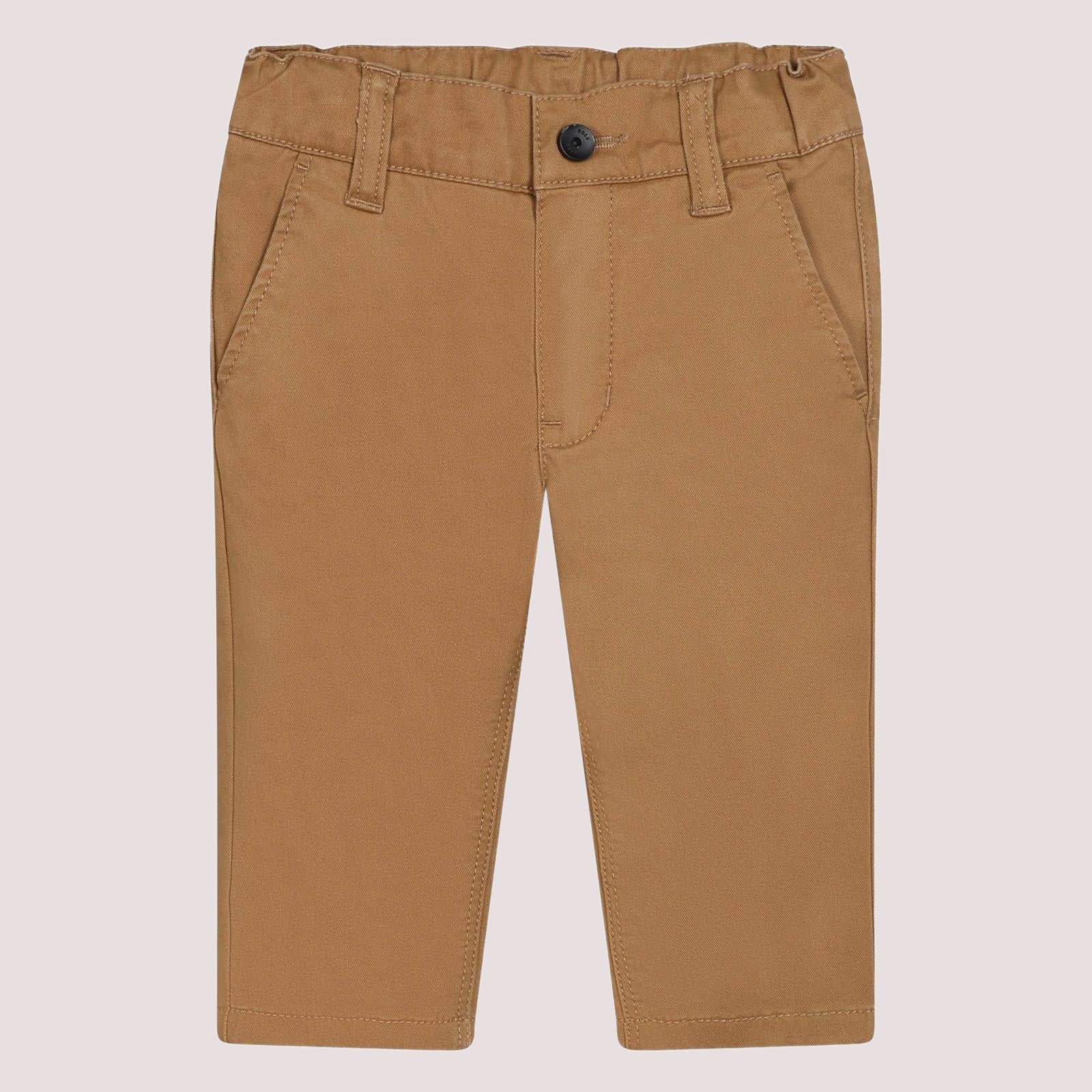 Pantaloni in twill di cotone/elastan, vita regolabile fino a 3 anni, 2 tasche laterali e 2 posteriori, etichetta a righe sulla tasca posteriore.