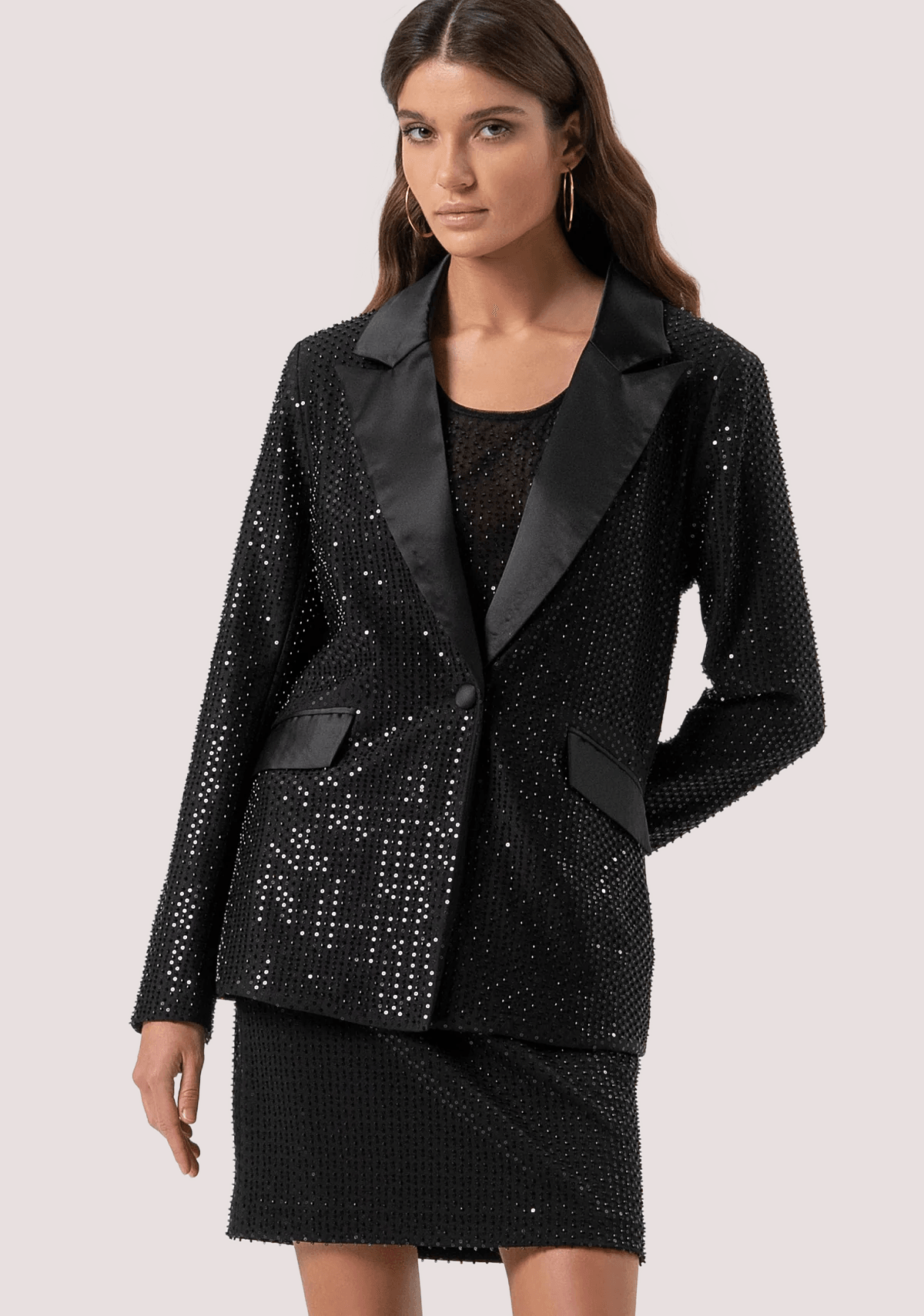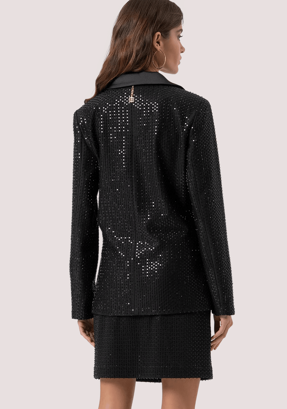 Blazer regular lungo monopetto con strass, revers a lancia in raso, tasche con pattina, e con maniche lunghe.