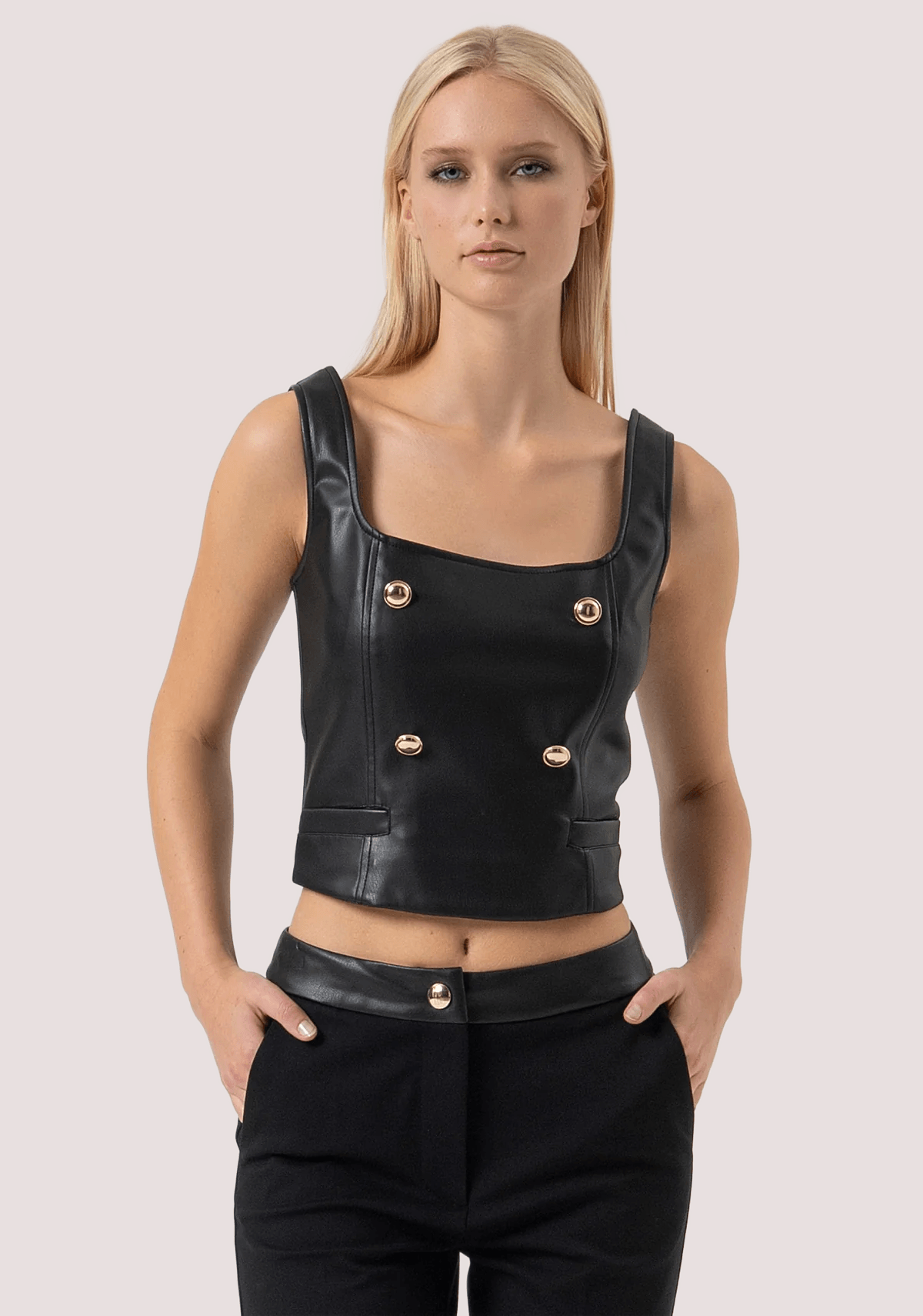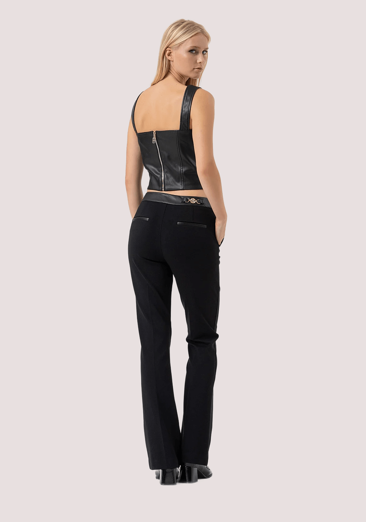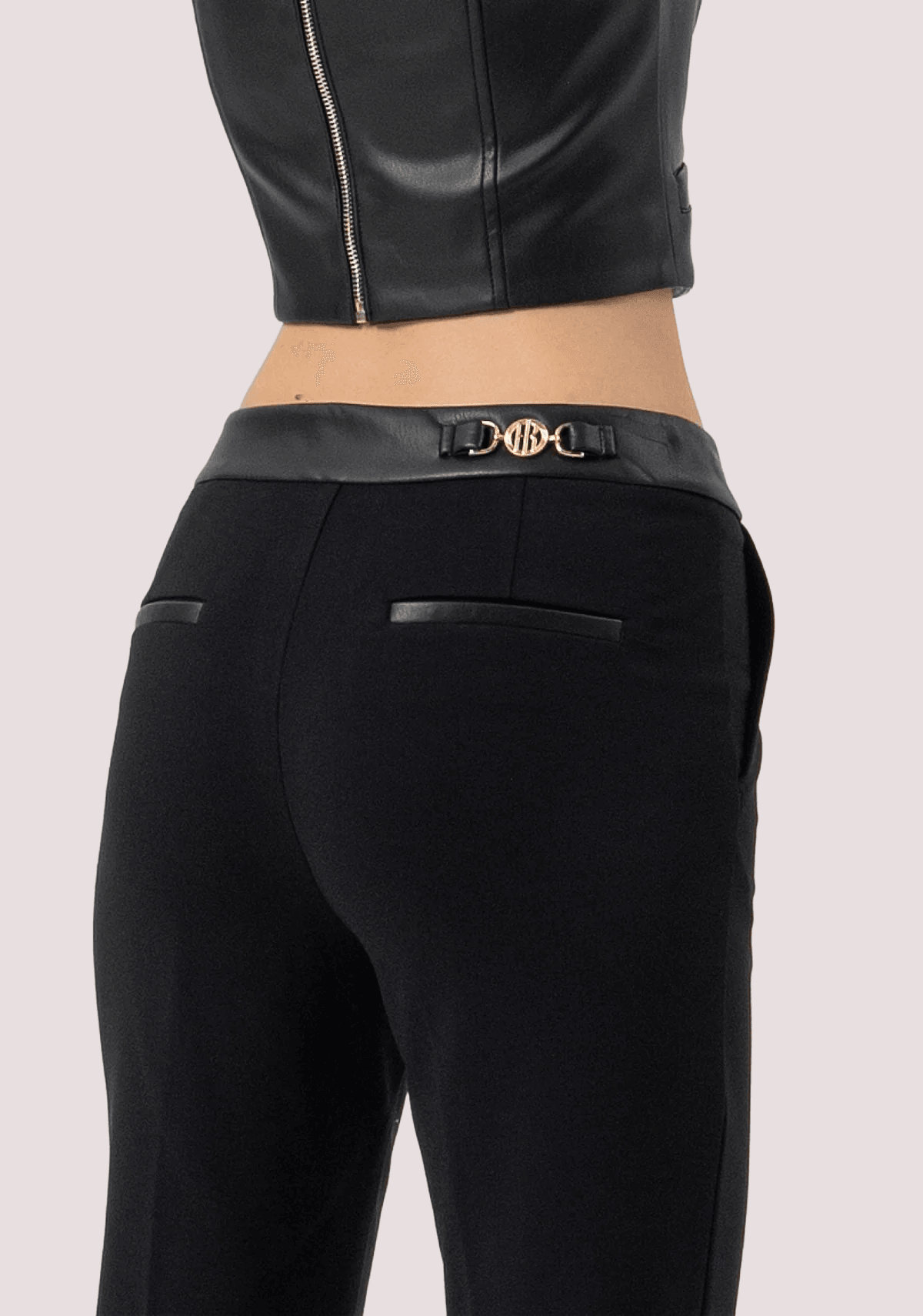 Pantalone bootcut in tessuto stretch, vita regolare con cinta in finta pelle, tasche alla francese, filetti sul retro, e con fondo largo.