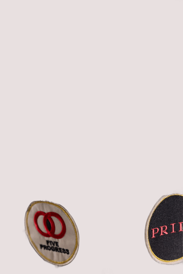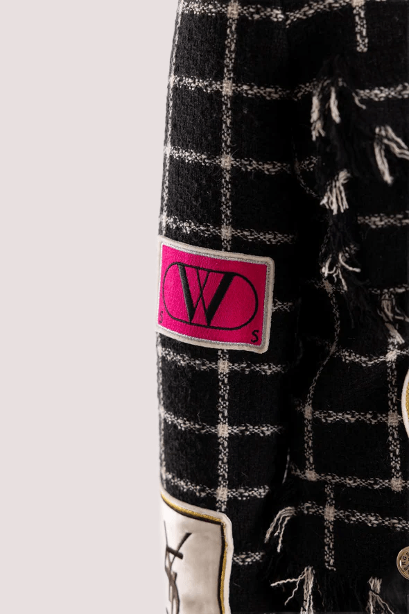 Cappottino corto con fantasia check, base nera e quadretti bianchi, applicazione di patch con strass su tutta la giacca, bordini sfrangiati, firmata 5Progress.Fodera macula.Composizione esterno: 45%acrilico 30%poliestere 25%lanaComposizione fodera: 100%poliestere