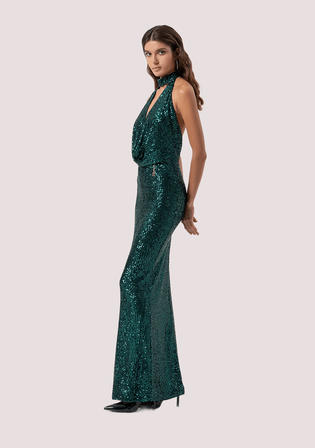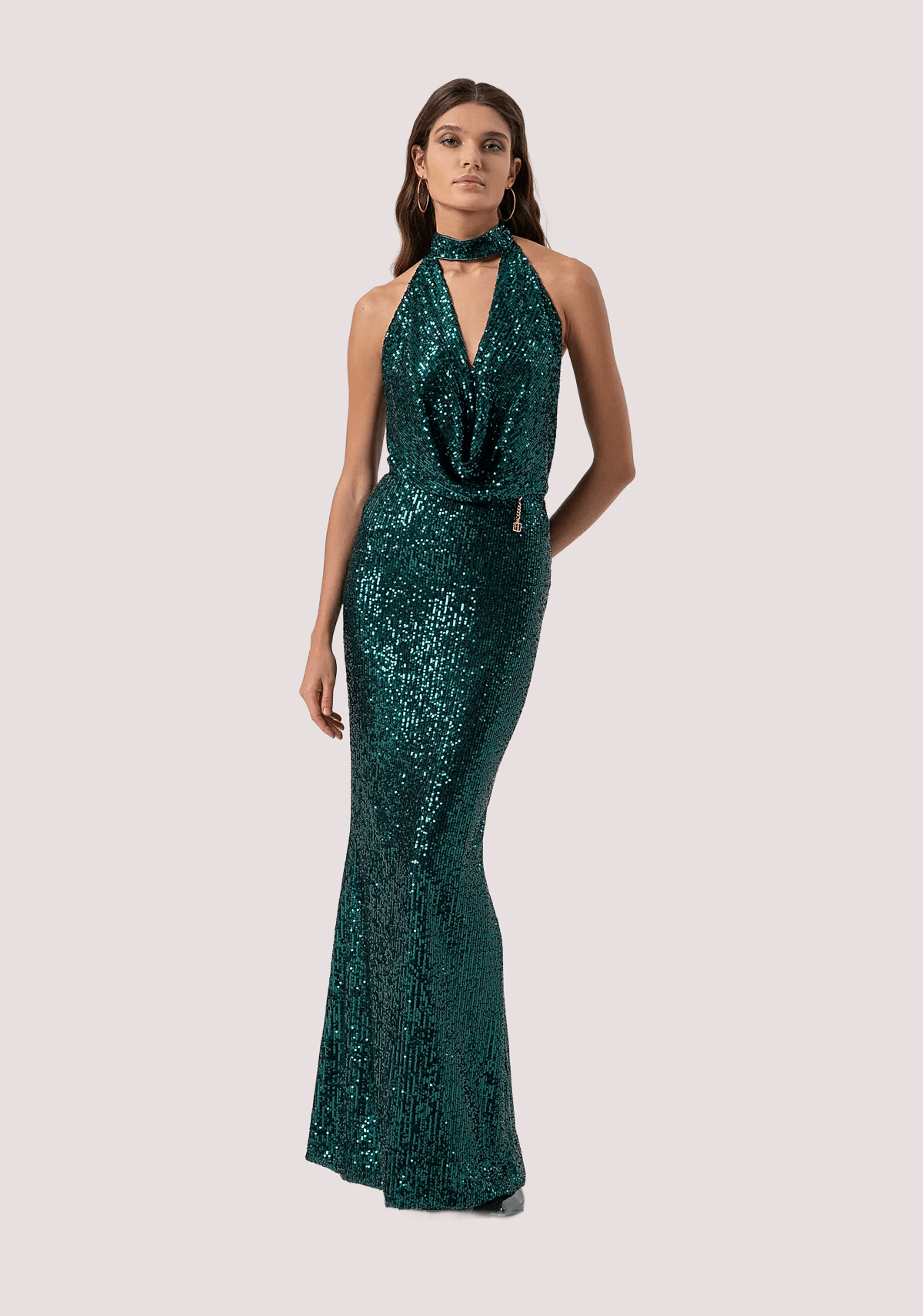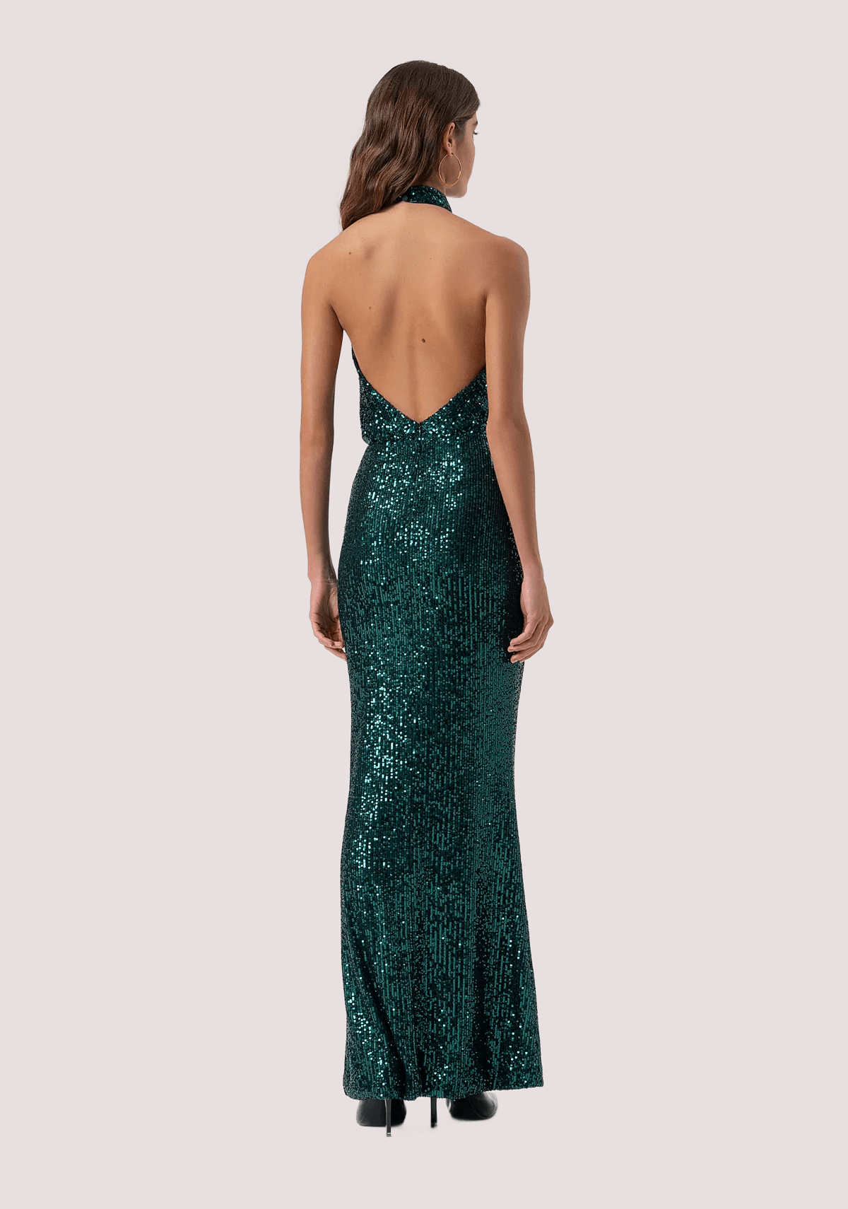 Abito senza maniche con paillettes, scollo a V con allacciatura al collo, schiena nuda, e con gonna a sirena lunga.