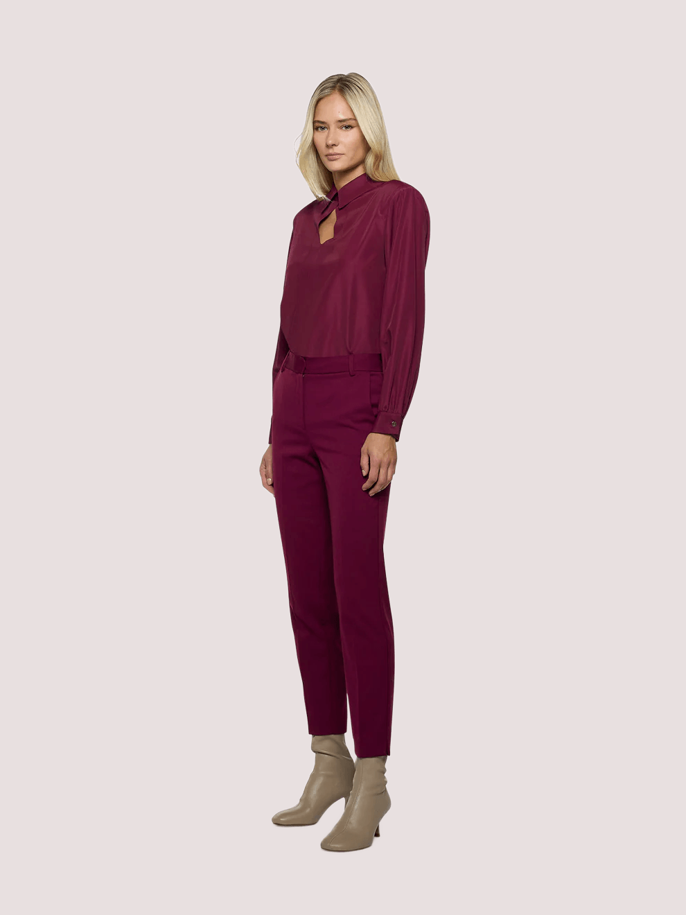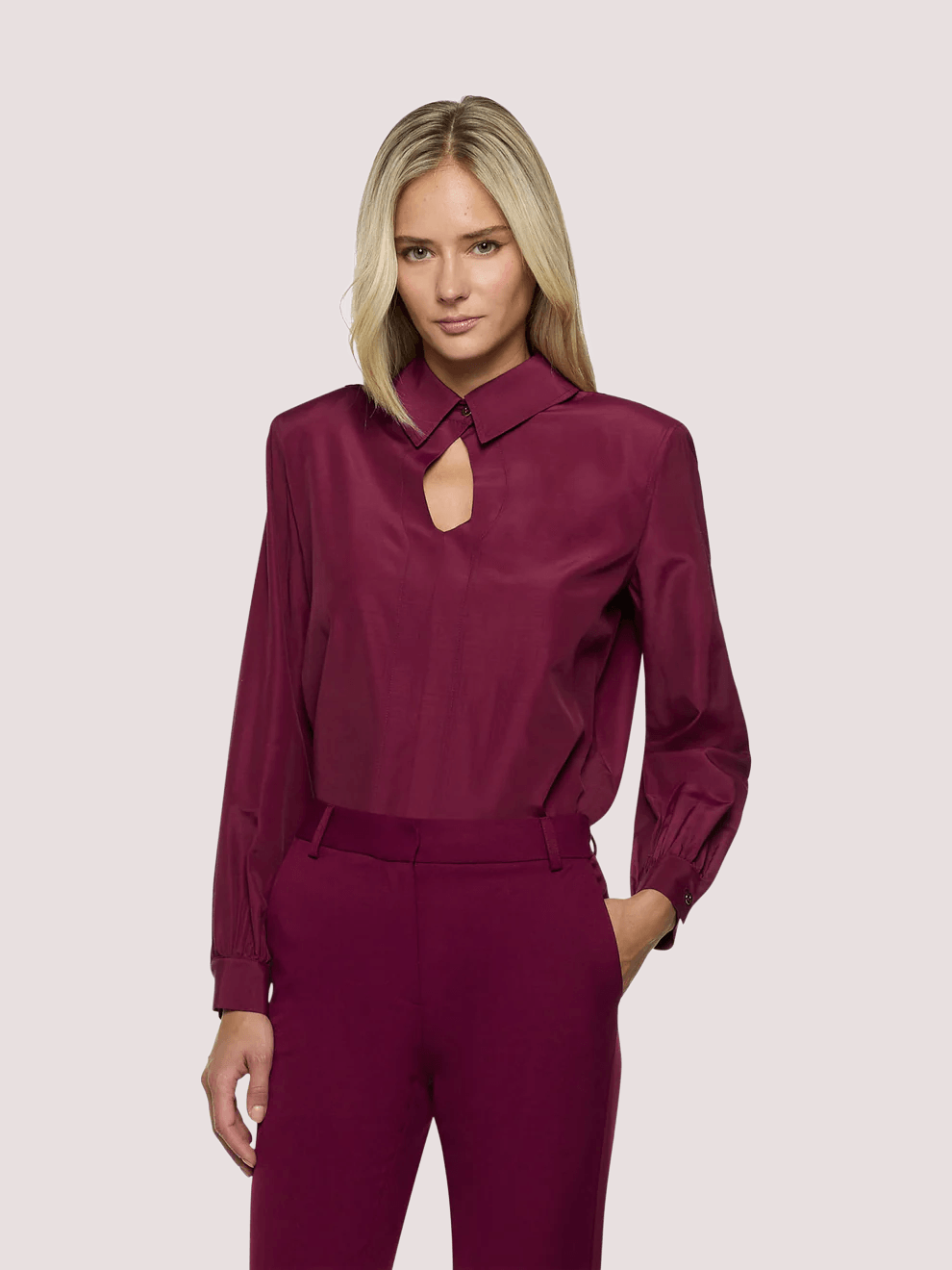 Camicia in tecno fluido con cut out a goccia frontale e abbottonatura sul dietro. Maniche lunghe con arricciatura finale e polsino davanti con spacco e chiusura con bottone sul dietro. Spalline interne.