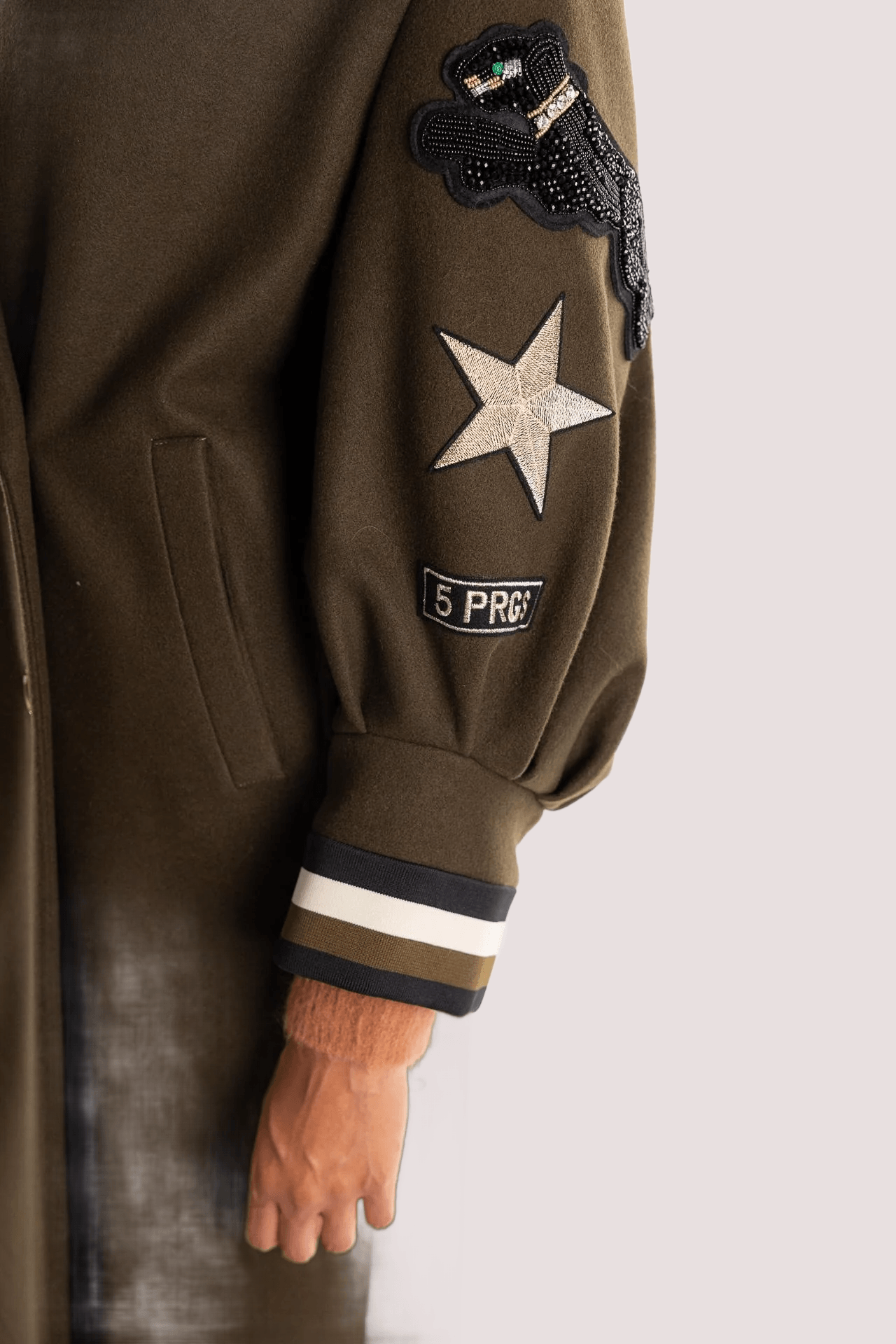 Cappotto over in tessuto misto lana verde militare con fodera interna animalier a contrasto. Patch applicati. Fit over. Collo a rever. Chiusura doppio petto con bottoni. Tasche a filetto. Spacco centrale posteriore. Maniche ampie con polsino finale a contrasto. Composizione 60% acrilico 30% poliestere 10% lana.