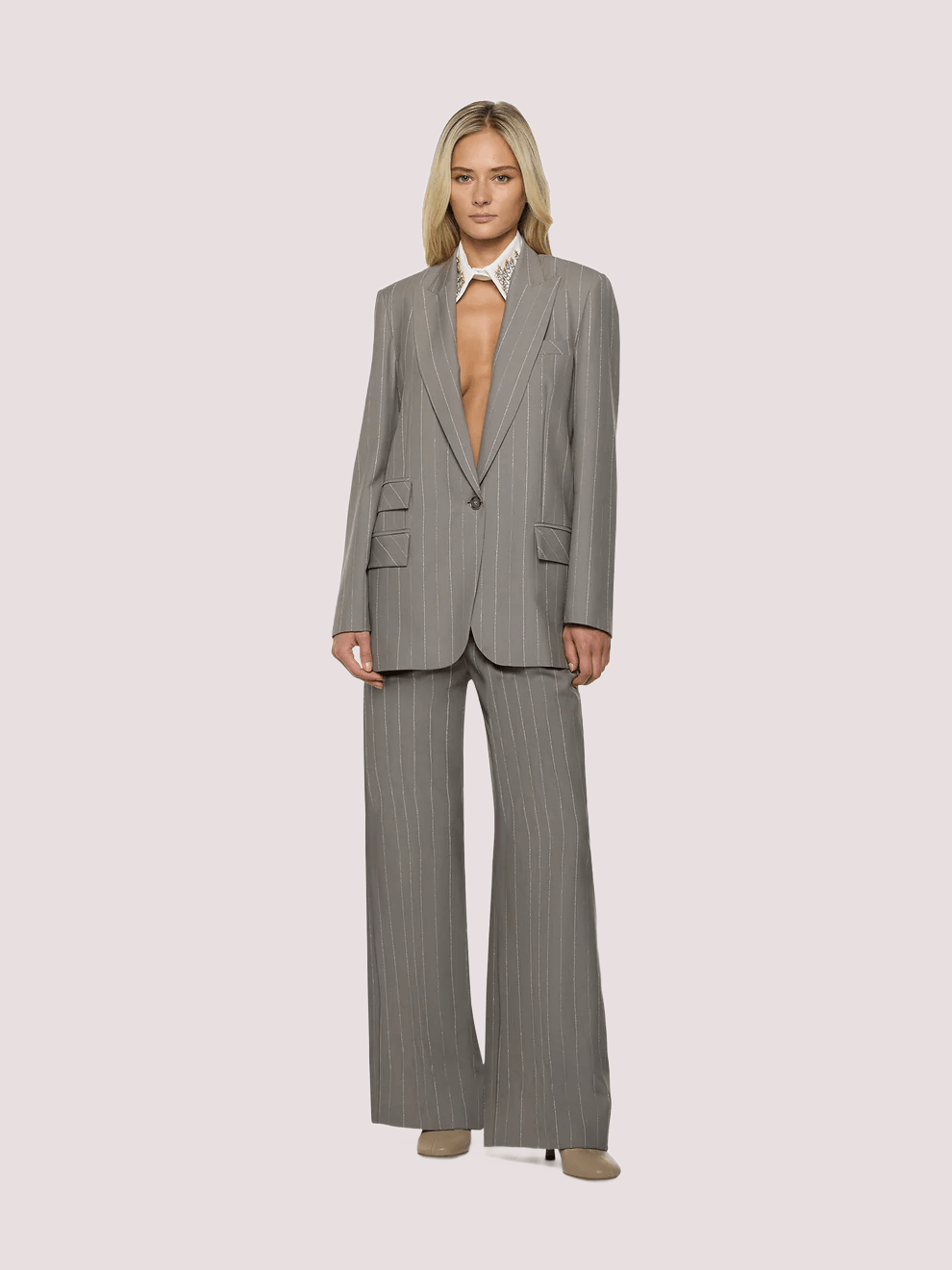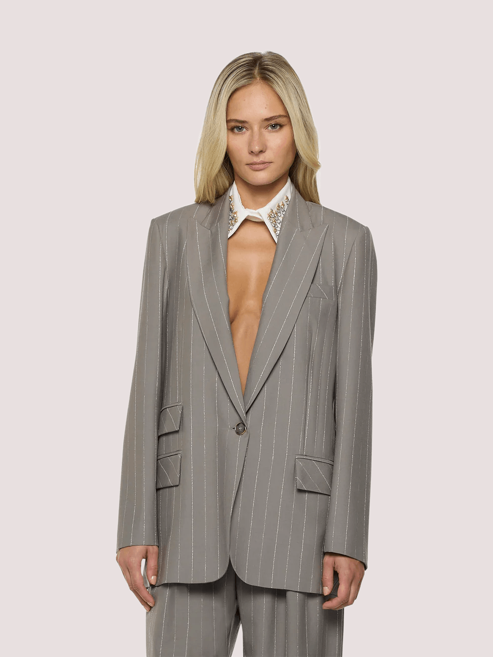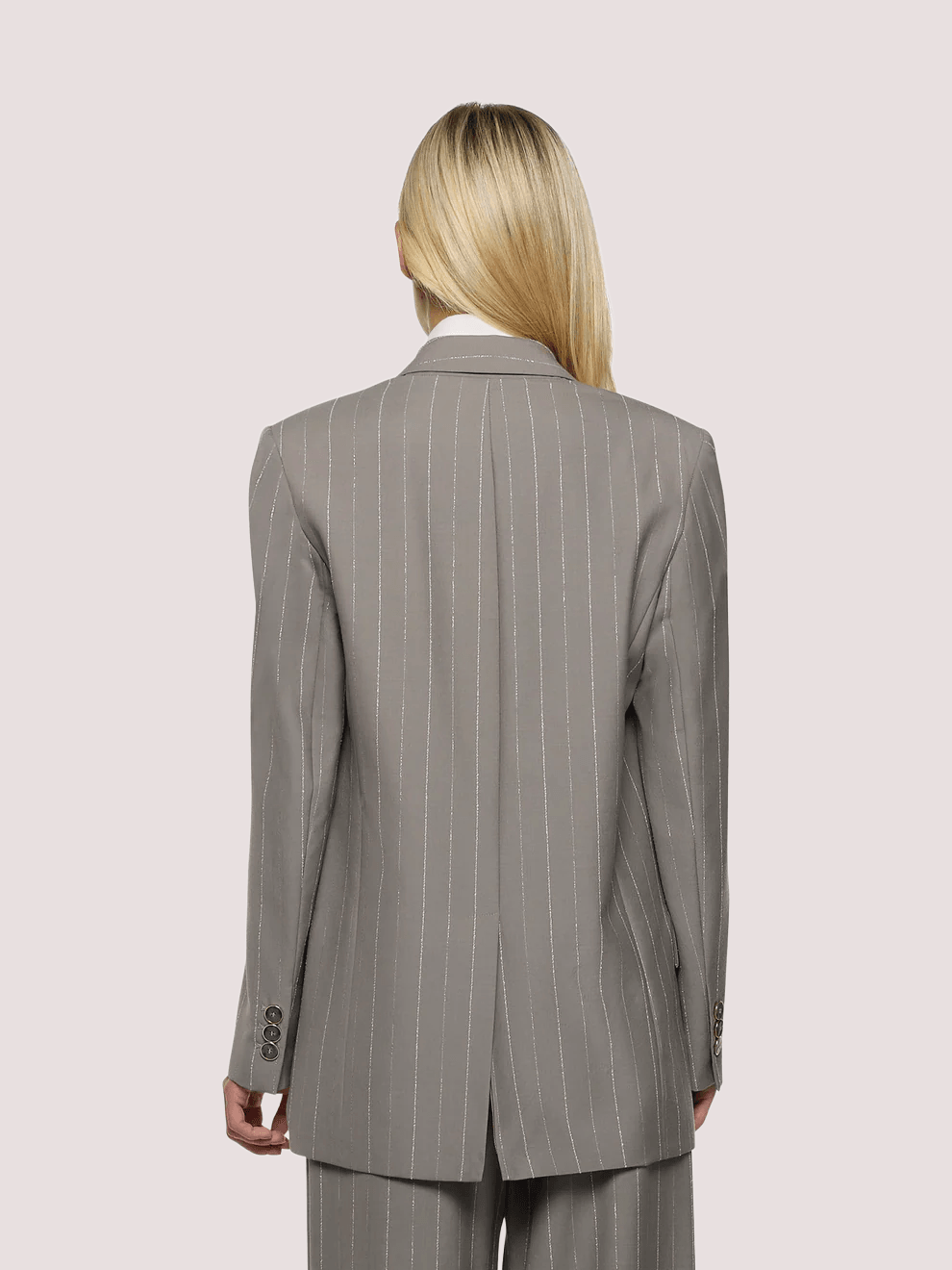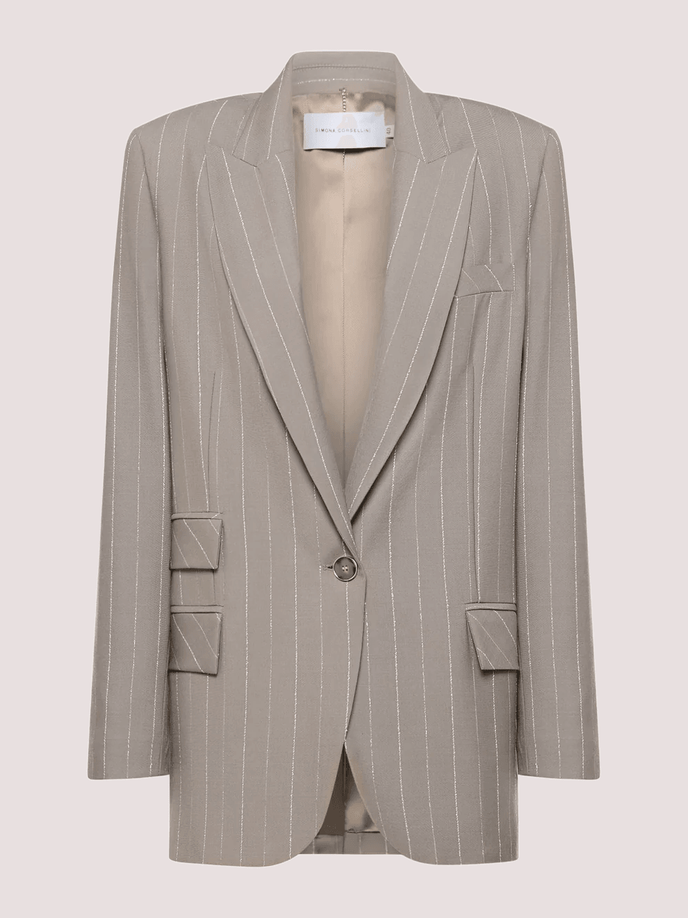 Giacca dritta monopetto con un bottone in gessato. Tasche con patta e spalline interne.