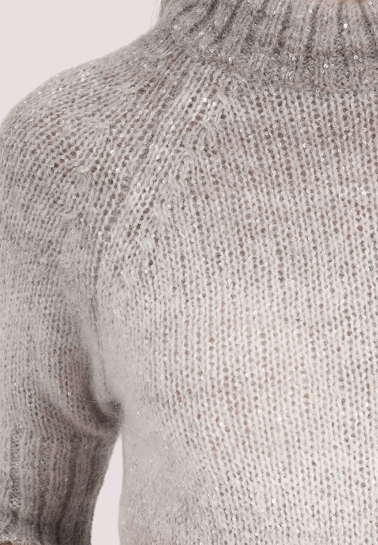 Maglione girocollo in filato , sfumato grigio e beige con delicati fili lurex che aggiungono un tocco luminoso. Presenta maniche corte a costine, collo leggermente alto e lavorazione a maglia rasata con finitura elasticizzata sul fondo per una vestibilità aderente ma confortevole. Un capo versatile, ideale da indossare con pantaloni a vita alta o gonne midi per un look raffinato ma casual. Perfetto sia per il giorno che per le occasioni più eleganti con accessori scintillanti.