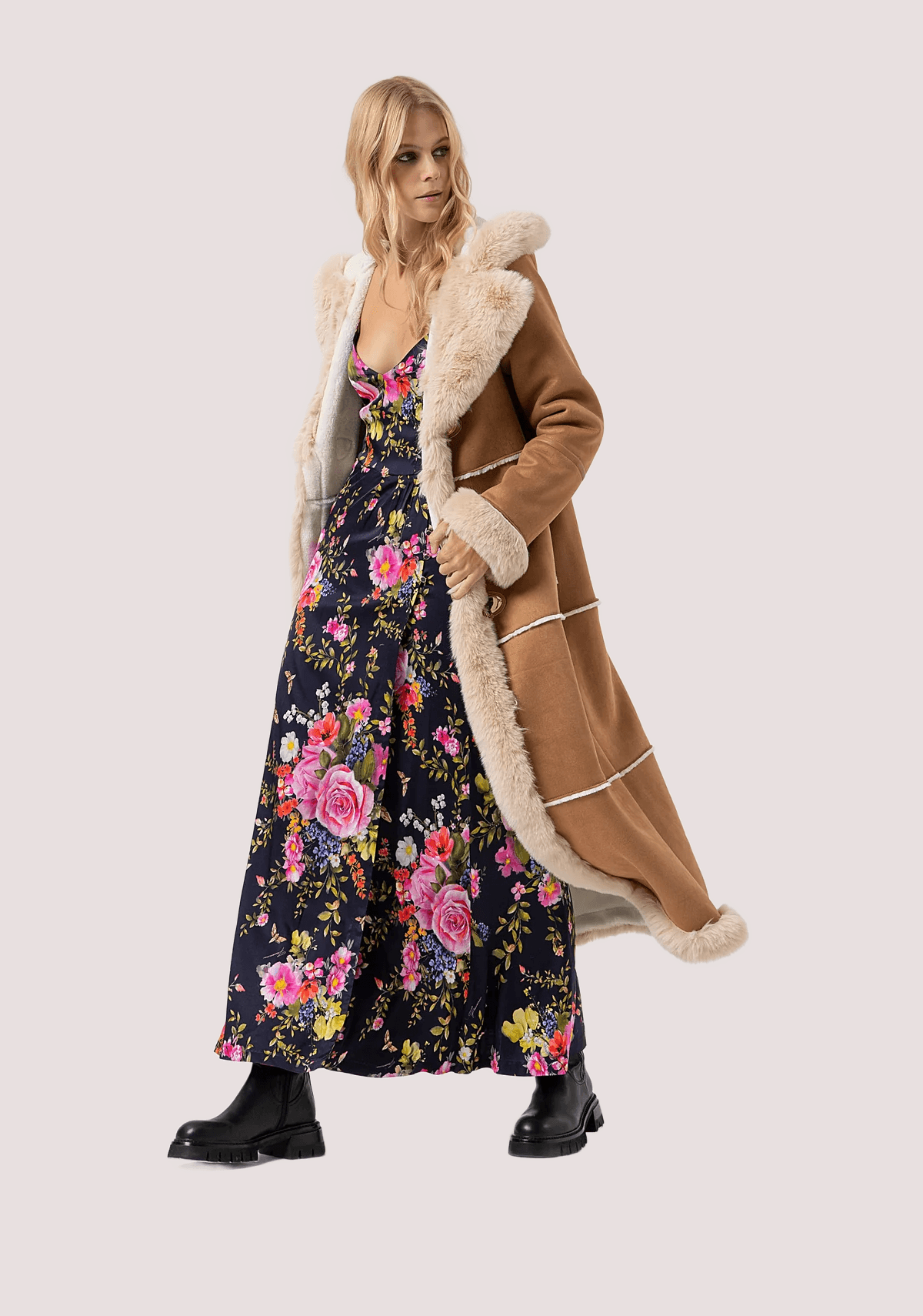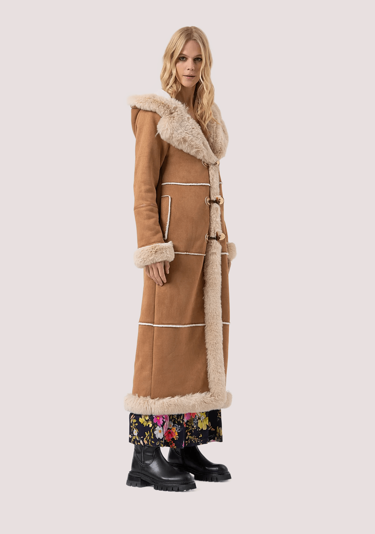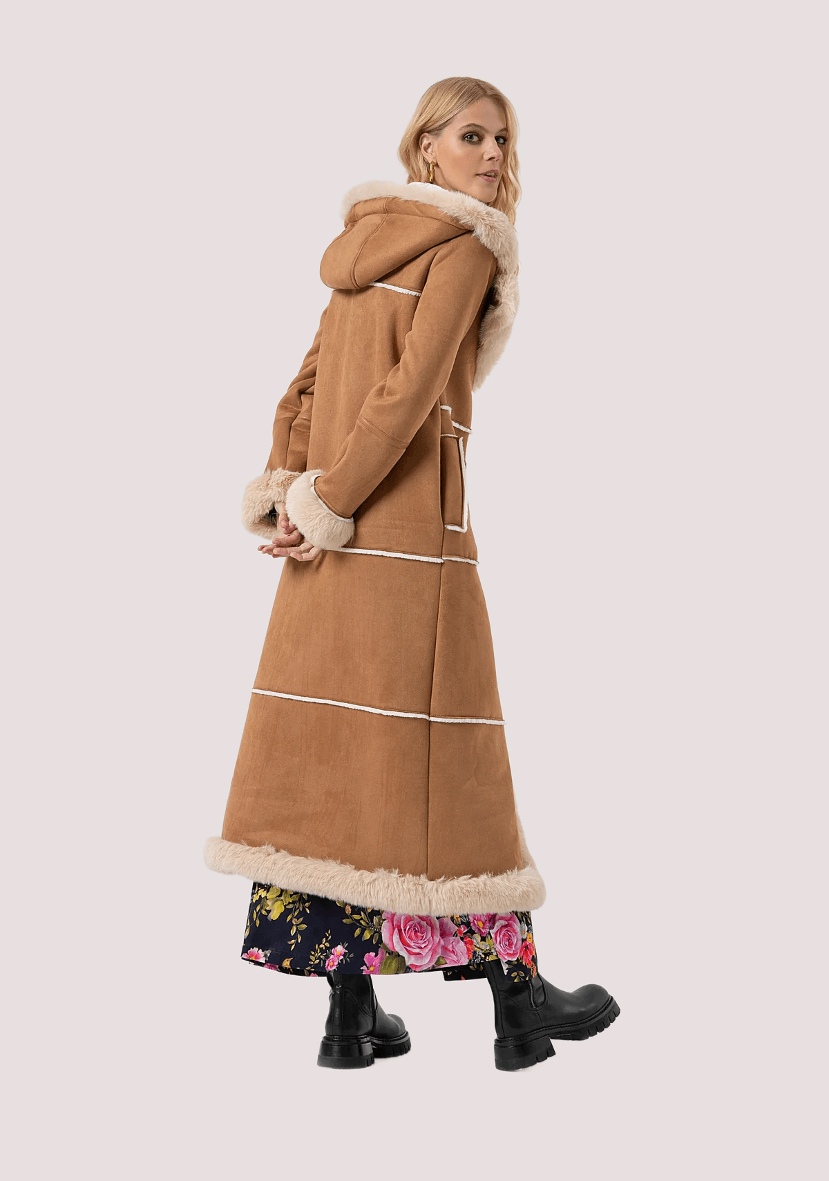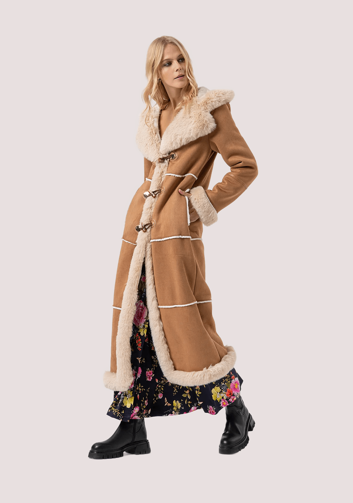 Montgomery regular lungo con cappuccio, inserti in finta pelliccia, tasche laterali, e con maniche lunghe.