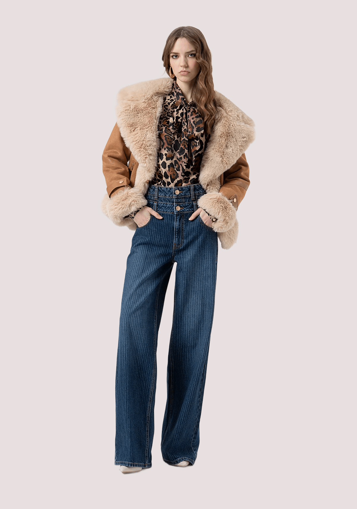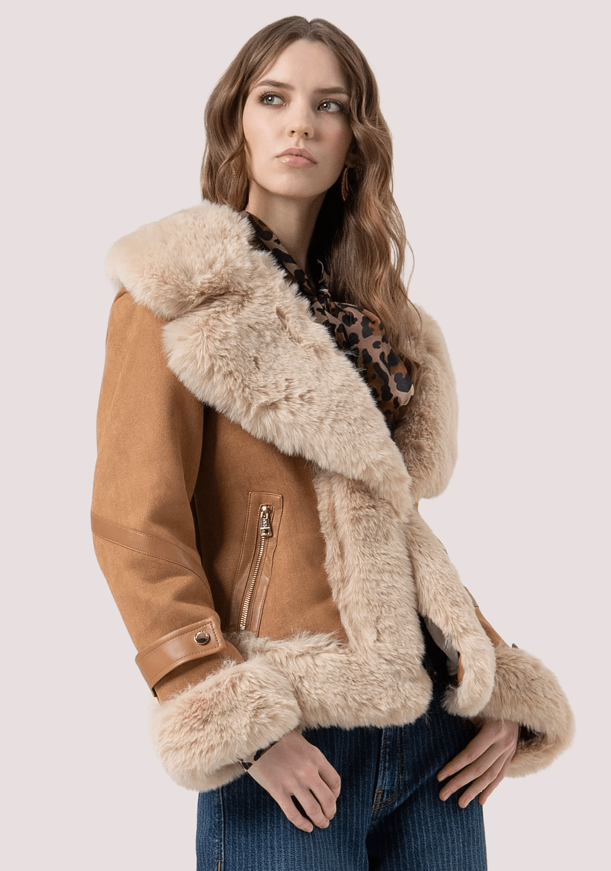 Giacca biker regular con apertura centrale, inserti in finta pelliccia, revers ampio, tasche con zip laterali, e con maniche lunghe.