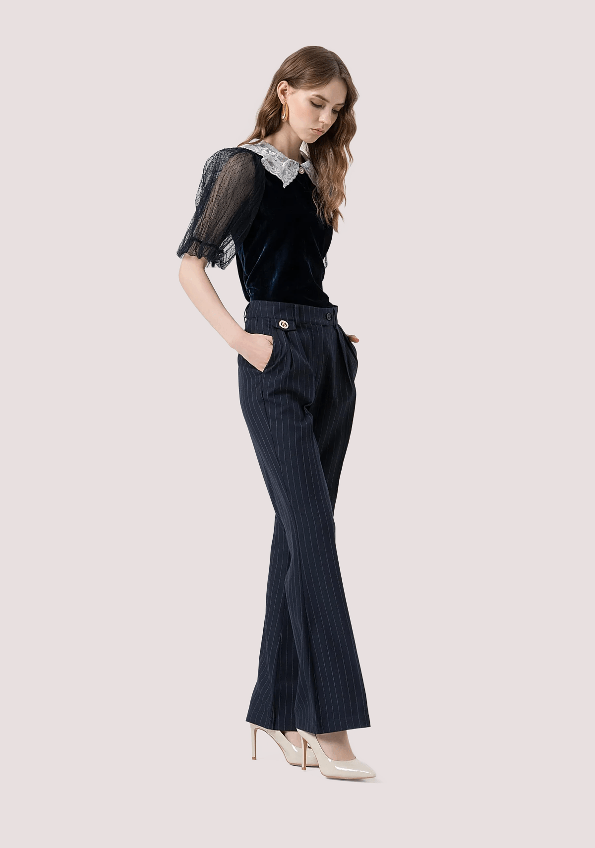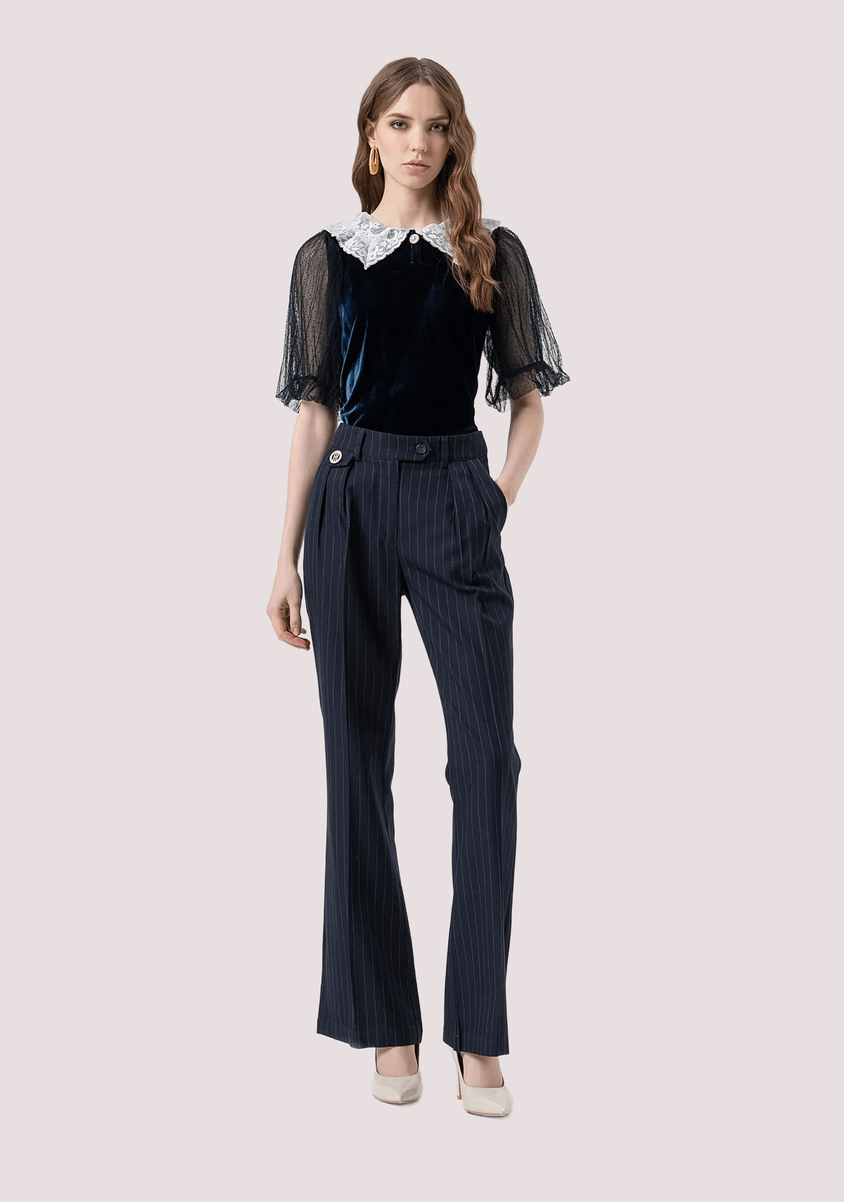 Pantalone flare in fantasia gessata, vita regolare, tasche alla francese, tasche pattina dietro, e con fondo largo.