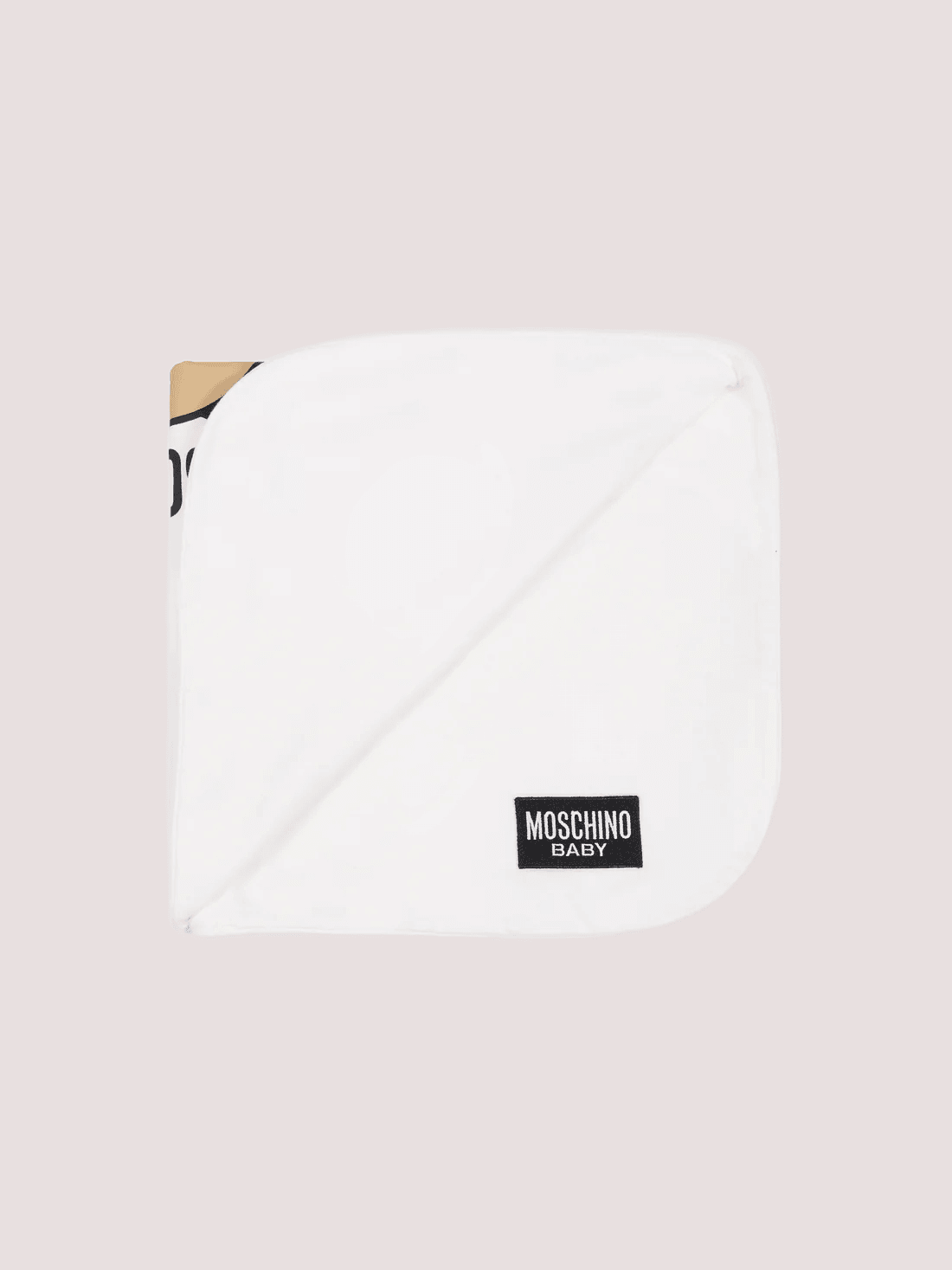 Coperta avorio del brand Moschino Kids, realizzata in cotone; é decorata con stampa Teddy Bear e logo sulla parte anteriore. Dimensioni (L x A): 69cm x 70cm
