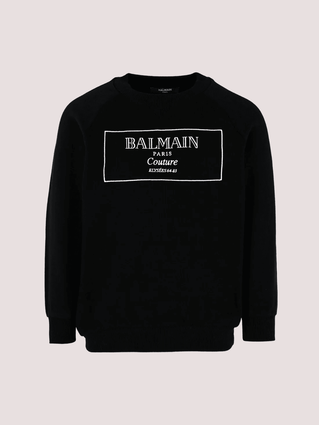 Felpa nera in cotone organico leggermente felpato, a maniche lunghe, con girocollo, polsini e orlo a costine. È decorata con logo Balmain Couture, ricamato sulla parte anteriore.Composizione: 100%cotone Organico